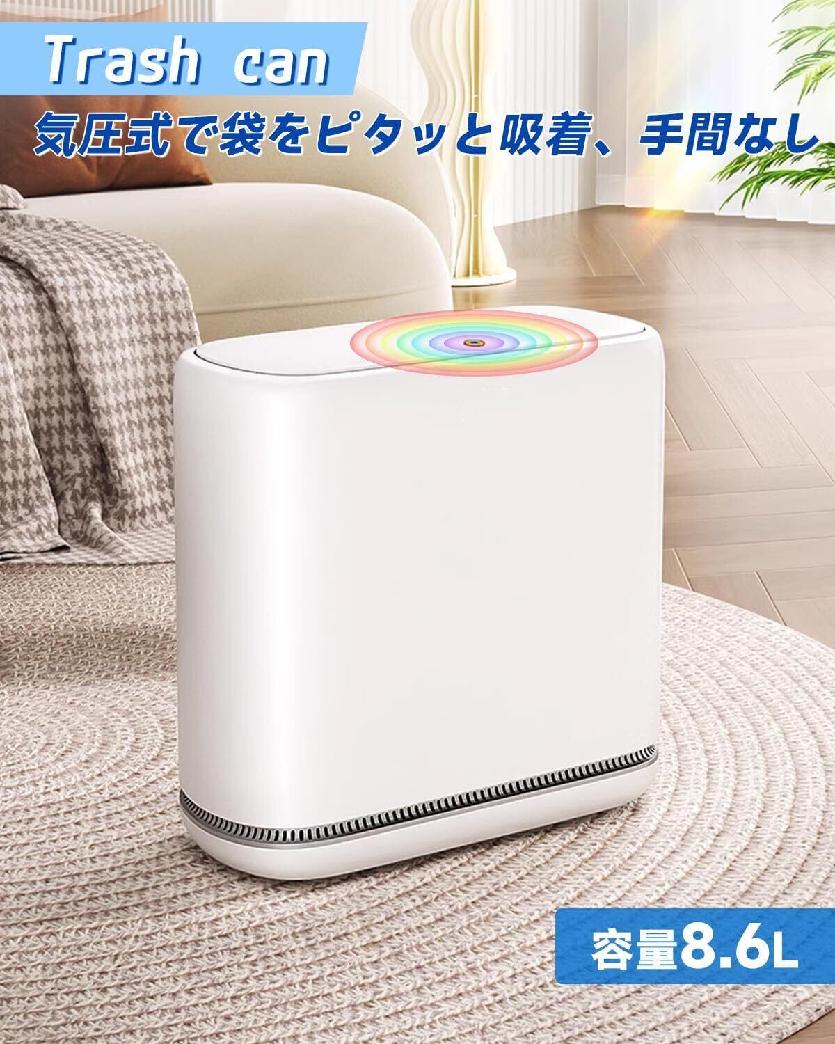 「この『O-MART ふた付きゴミ箱』で、スタイリッシュで機能的な空間を手に入れましょう!」/特徴:自動フィットのゴミ袋設計と防水・防臭機能を備えた、使いやすい8.6L大容量ゴミ箱です。
