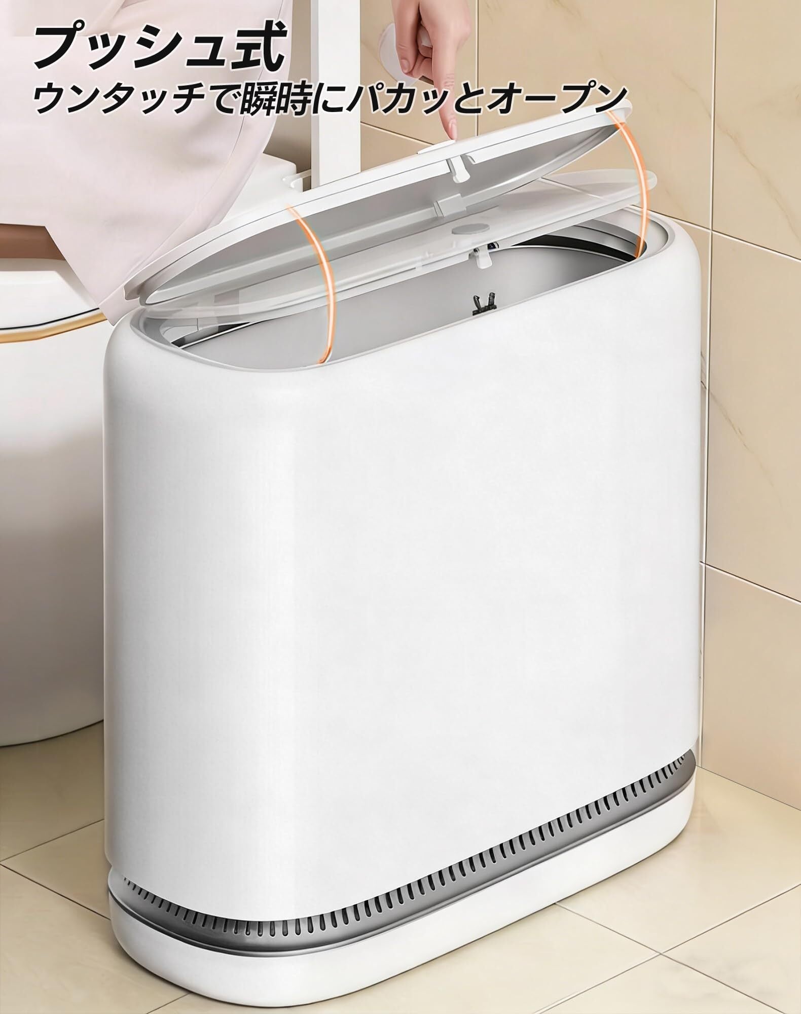 【ワンプッシュ式】ワンタッチで簡単に蓋が開くデザインを採用しています。密閉性の高い蓋は、防水・防臭機能を備えており、ゴミの臭いをしっかりと閉じ込め、清潔で快適な環境を提供します。さらに、蓋は6000回以上の開閉テストをクリアしており、スムーズで引っかかりのない動作を実現しています。