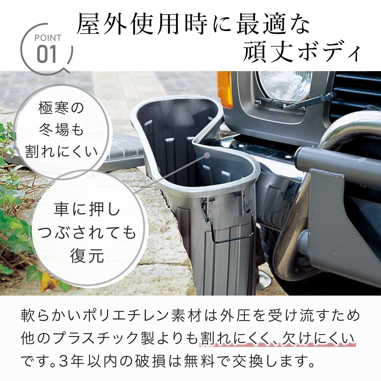 「この『岩崎工業 ゴミ箱』で、頑丈でスタイリッシュなゴミ処理を実現しましょう!」/特徴:屋外用に設計された45Lのフタ付きゴミ箱は、丈夫な構造とおしゃれなシルバー仕上げで、すっきりとした外観を演出します。