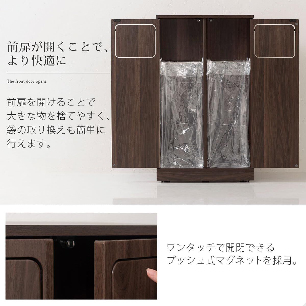 「この『縦型ゴミ箱』で、洗練された分別ゴミ管理を実現しましょう!」/特徴:45リットルの大容量を持つこのダストボックスは、スイング式の蓋が付いており、日常のごみ分別に最適です。キャスターが付いているため、移動も楽々。木目調のデザインで、家庭やオフィスのインテリアにぴったり合います。