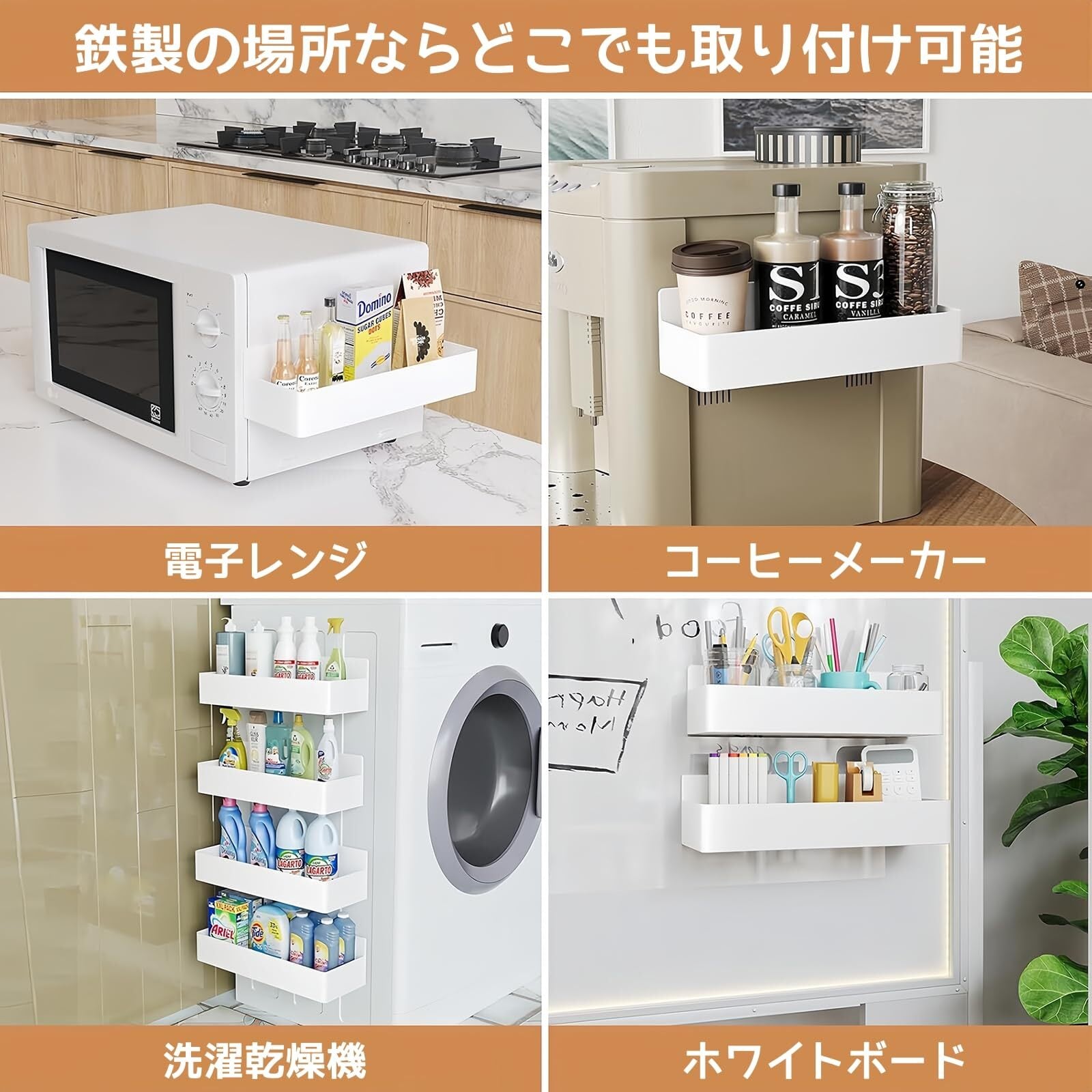 【強力な磁力で張り付き】裏面に大きなマグネットが設置され、強力な吸着力があり、4㎏が耐えられます。鉄が含まれる壁面であれば貼り付けられます。例えば冷蔵庫、洗濯機など。