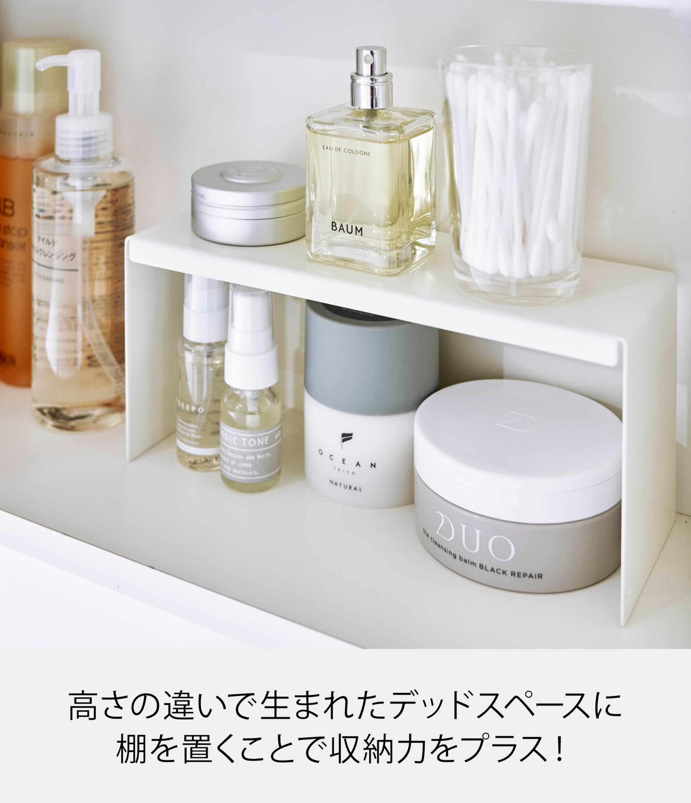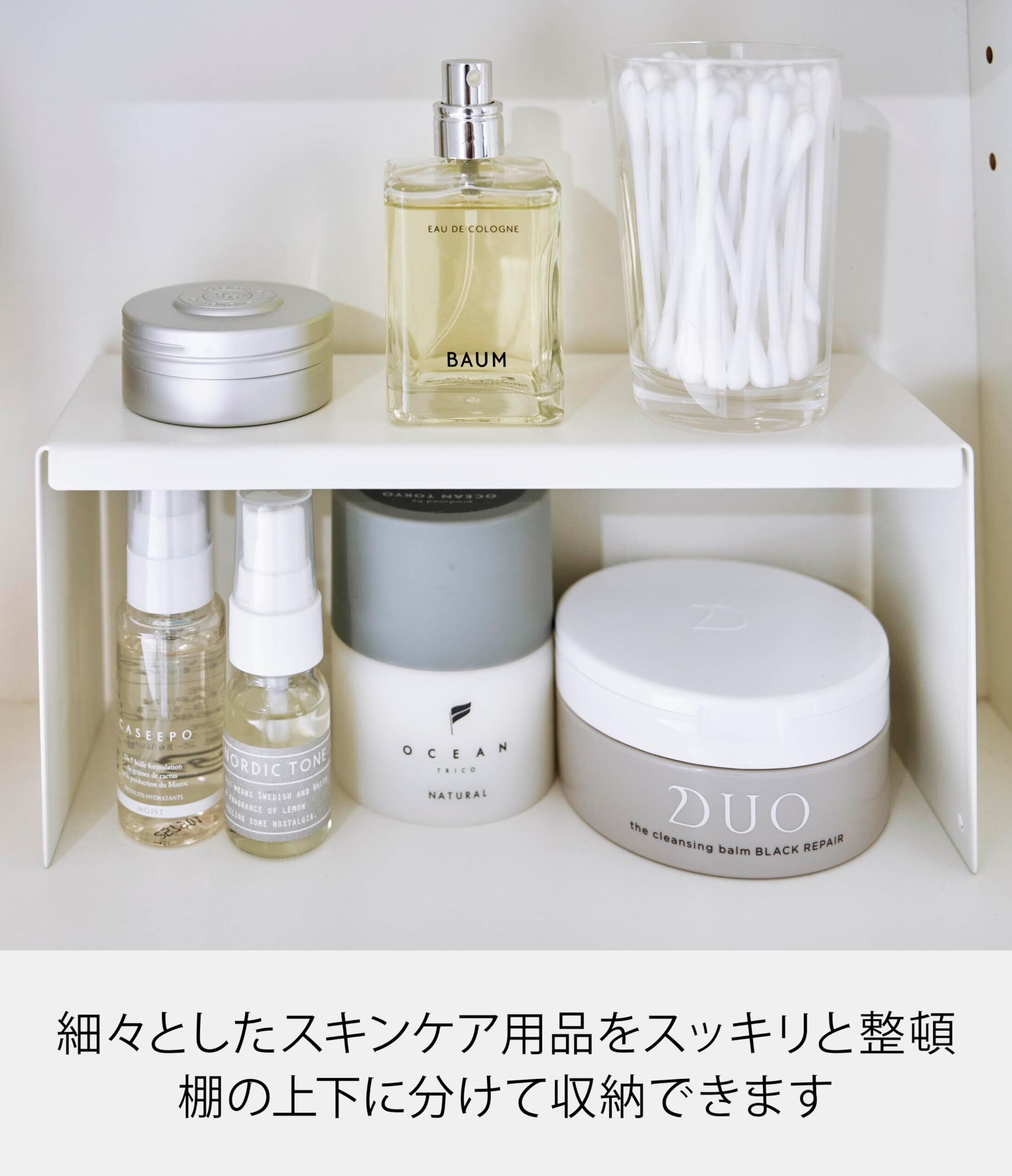 細々としたスキンケア用品を棚の上下に分けて収納できます。