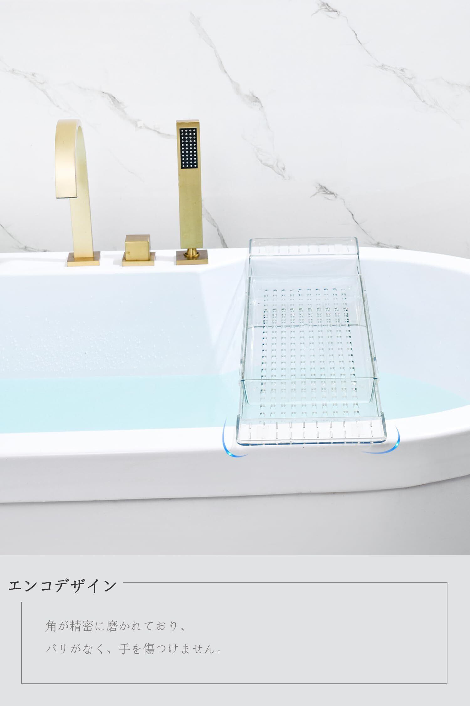 「この『Miitech バスタブトレー』で、あなたのお風呂タイムをより快適に演出しましょう!」/特徴:美しくクリアなデザインのこのバスタブトレーは、伸縮可能で56.5cmから80cmまで調整でき、さまざまなバスタブにぴったりフィットします。お風呂の水分を気にせず、コーヒーやお好きな本を手元に置いて、リラックスしたひとときをお楽しみいただけます。