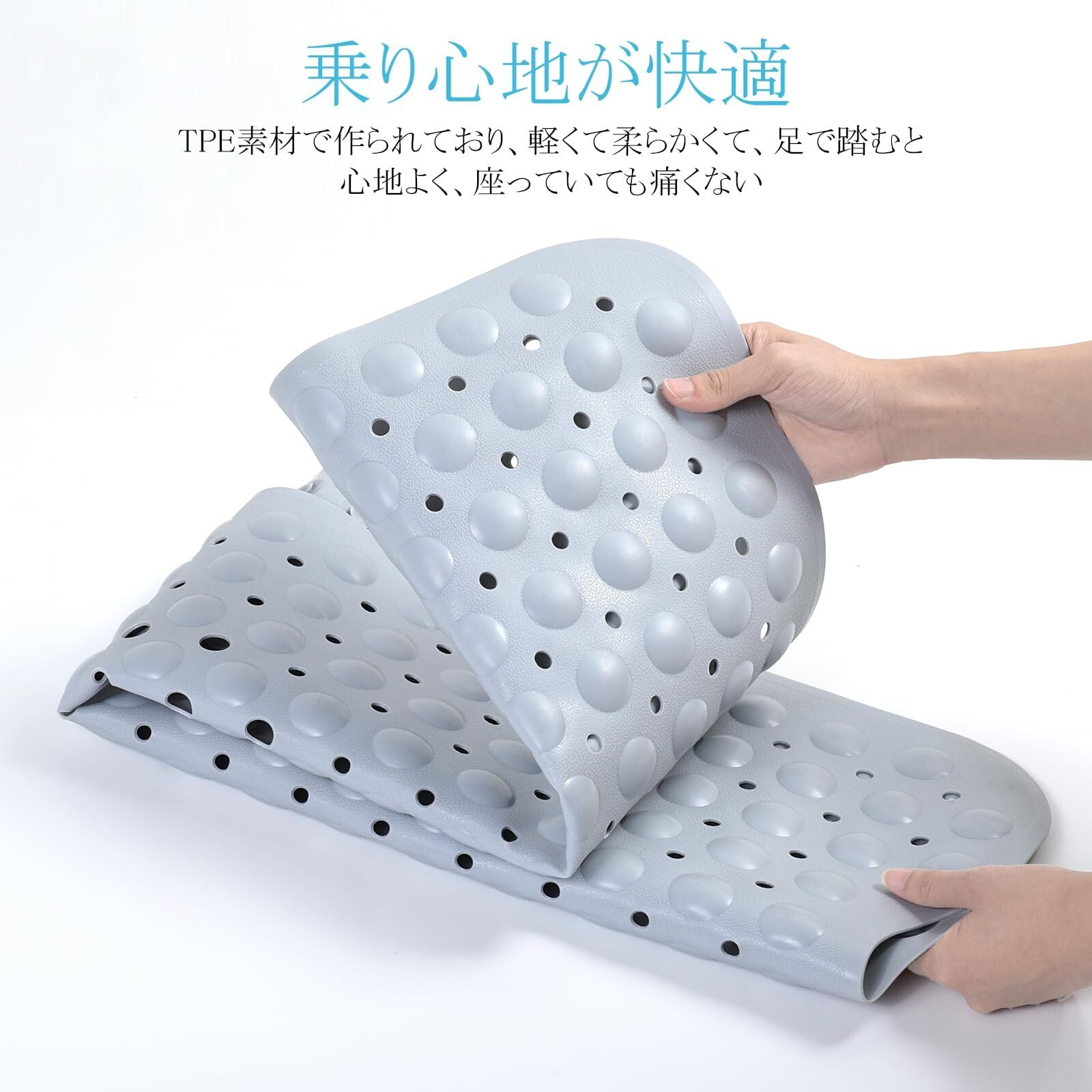 TPE製のこのマットは、200個の吸盤がしっかりと床に固定され、濡れた足でも安心して使用できます。特に高齢者や小さなお子様がいるご家庭にピッタリで、転倒を防ぐための頼もしい味方となります。