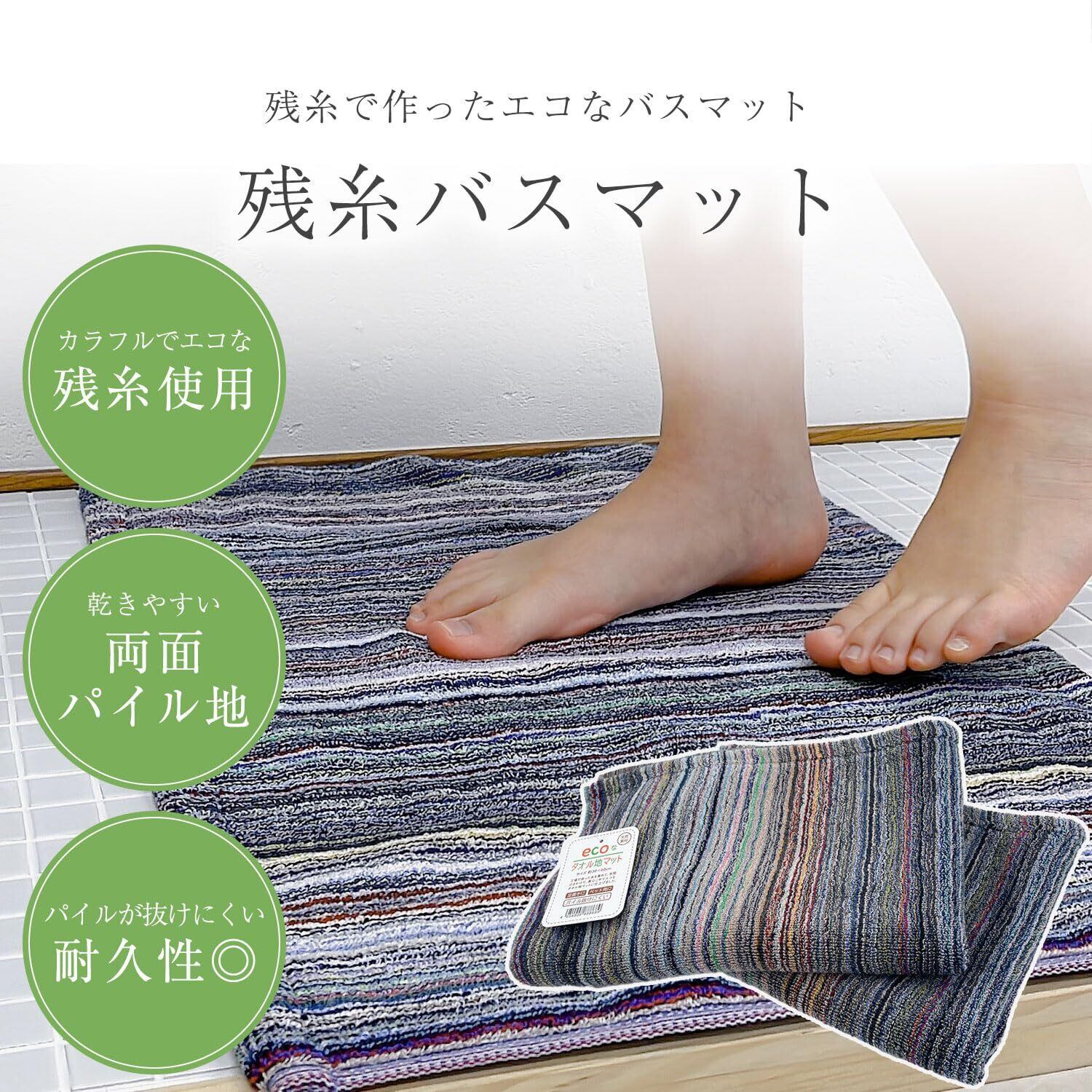 【残糸で作ったエコなタオル地バスマット】タオルを作る際に必ず出てしまう余り糸を使って織り上げました。一枚一枚少しずつ風合いの違うバスマットです。両面パイル地で吸水性・乾きやすさUP。引っ掛かりにくいショートパイルで使いやすく、汚れたらすぐに洗濯機で丸洗いできるのでいつでも清潔にご使用いただけます。