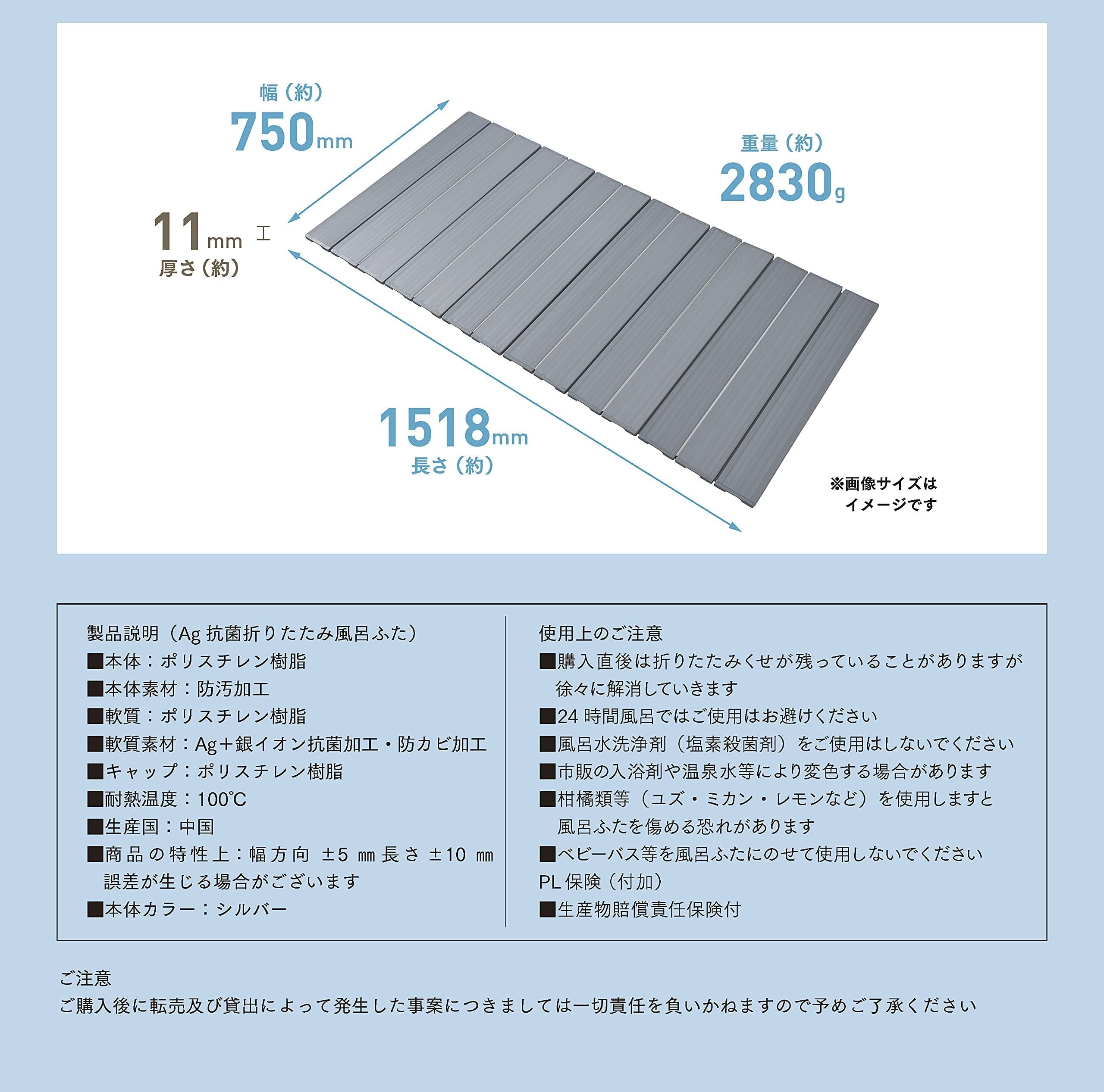 Belca(ベルカ) 風呂ふた Ag+銀イオン パタパタたためる 折りたたみ式 コンパクト 風呂ふた 幅75×長さ151.8cm シルバー 軽量 抗菌 防カビ 防汚加工 MS-OL15-SV