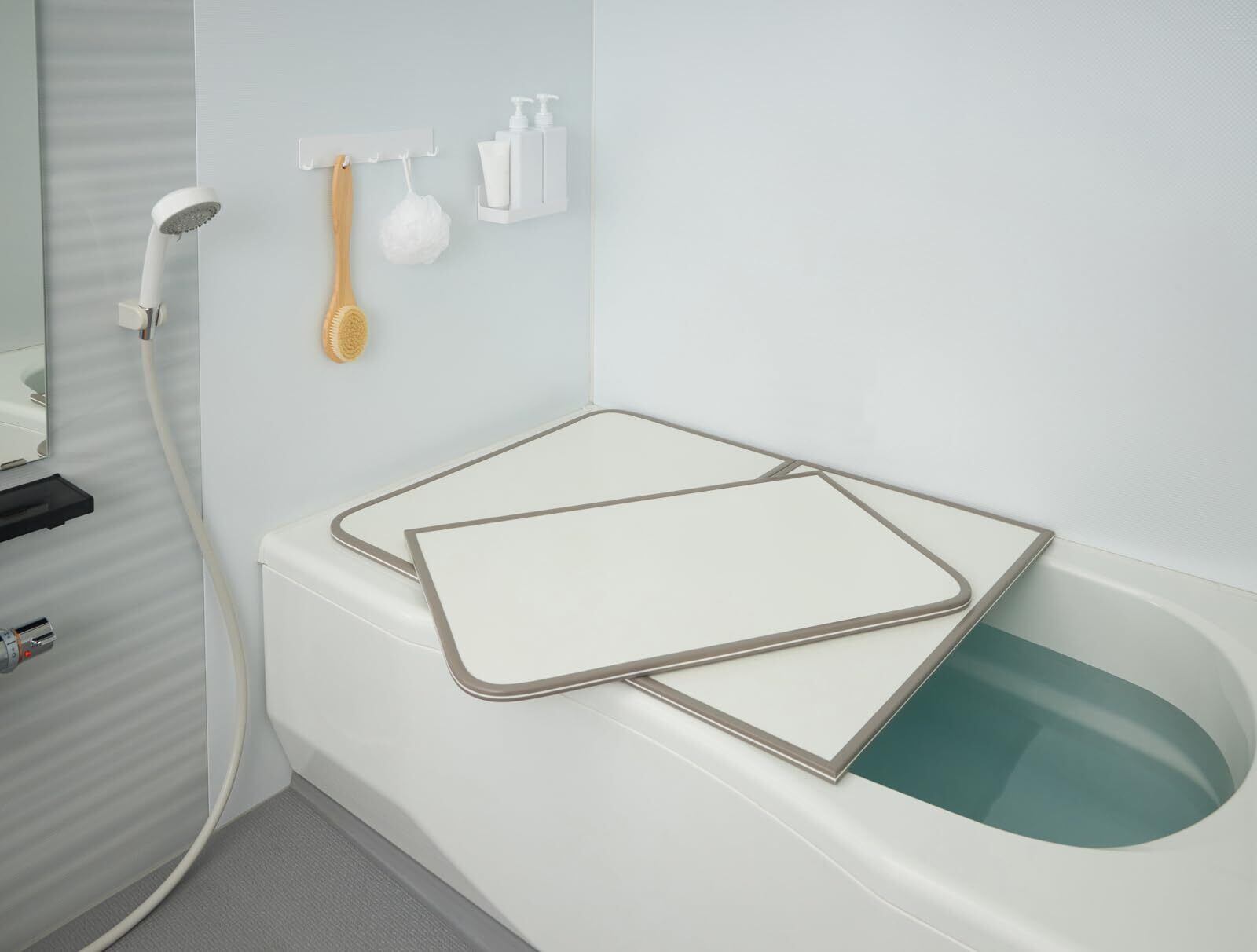 3枚組のデザインは、浴槽の形状に合わせて自由に組み合わせて使用できます。各パーツがしっかりとフィットし、使用しない時は軽量でコンパクトに収納できるので、とても便利です。