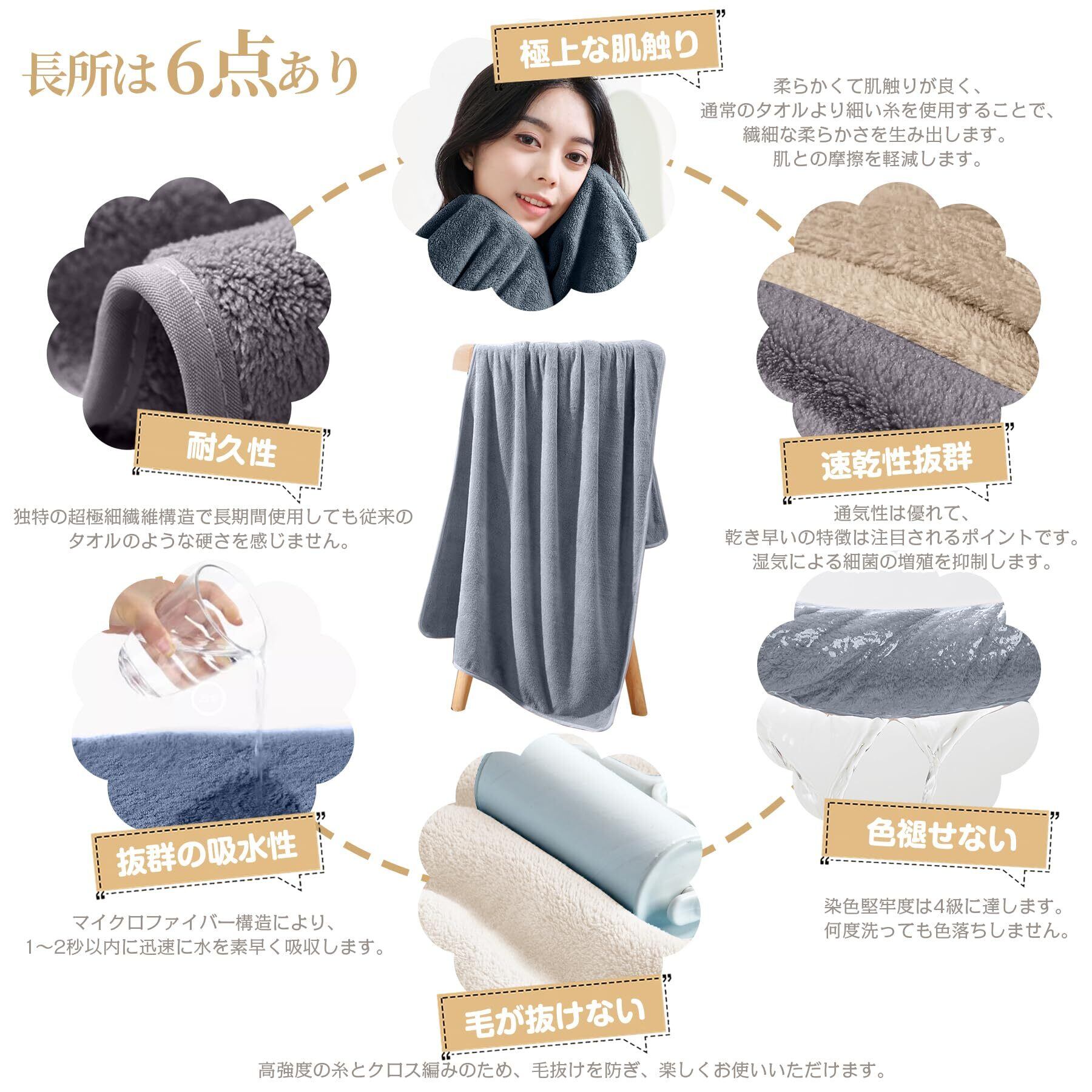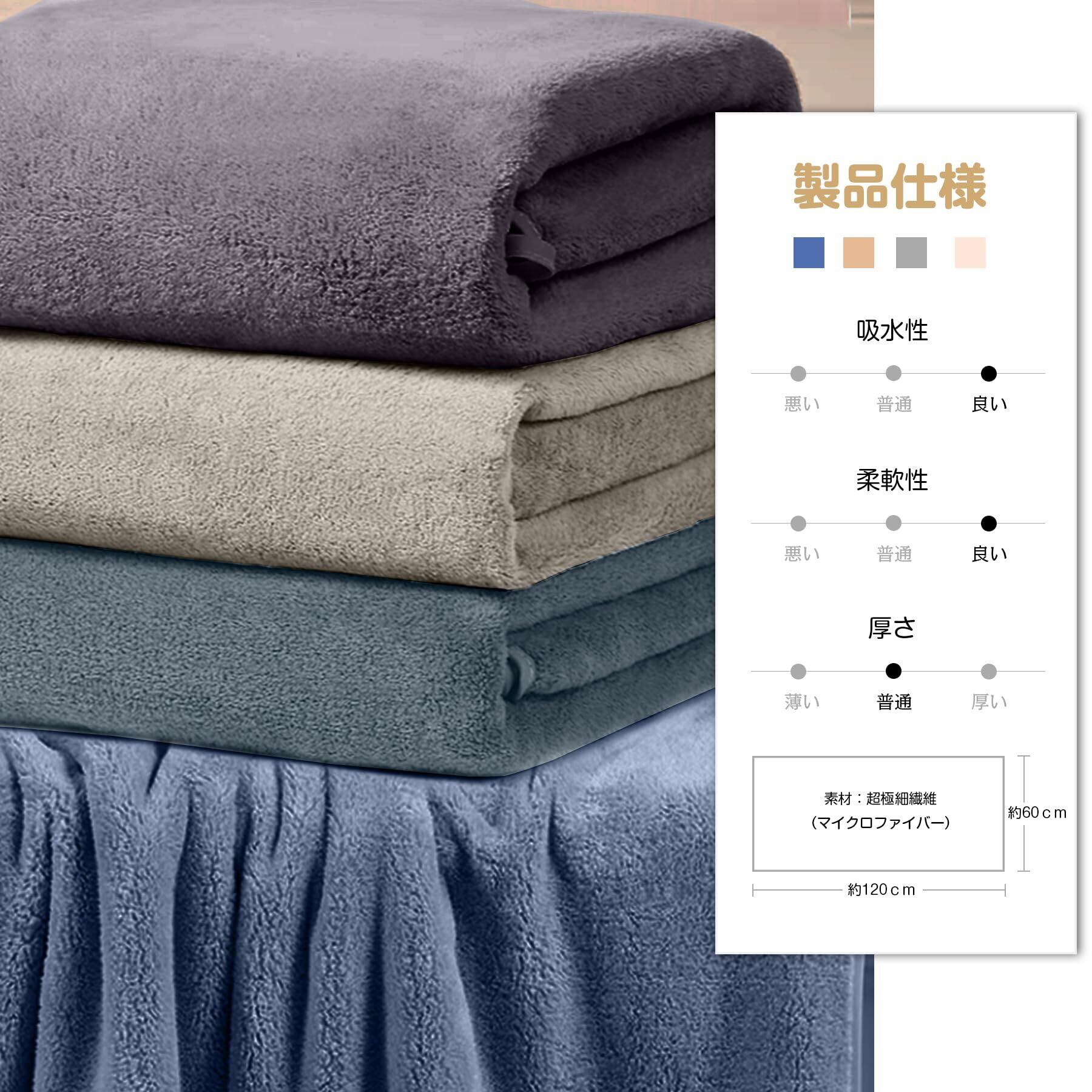 【コスパが良い】 このバスタオルは髪の毛の1/100のサイズのマイクロファイバー(極細繊維)で作られています。一般的なマイクロフアイバーのタオルと比ベて約2倍以上のボリュ-ムがあり、ふんわりと包み込まれるようなリッチな使い心地です。両面ともに厚手なのが機能性がさらにアップです!高密度なマイクロフアイバー生地を使用して、洗濯を繰り返しても、ボリューム感が保たれます。