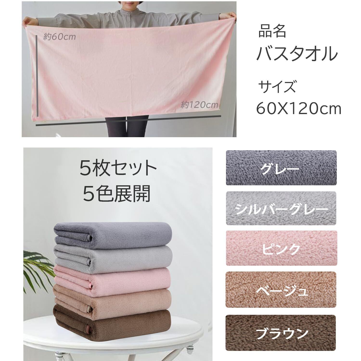 バスタオル マイクロファイバー タオル ふわふわ ホテル仕様 大判 5枚セット 60X120cm 瞬間吸水 速乾 耐久性 (5色)