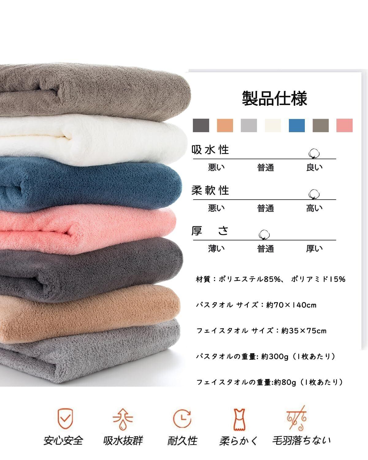 【Lumimi 8枚タオルセット】セット内容:4枚バスタオル(グレー 1枚+スモーキーブルー 1枚+モカブラウン 1枚+ピンク 1枚)+4枚フェイスタオル(グレー 1枚+スモーキーブルー 1枚+モカブラウン 1枚+ピンク 1枚)。フェイスタオル サイズ:約75長さ*35幅 cm、重量:約80g(1枚あたり)バスタオル サイズ:約140長さ*70幅 cm、重量:約300g(1枚あたり)出張、旅行、入浴、ご家族皆さんが満足できます、様々な場合で活躍。