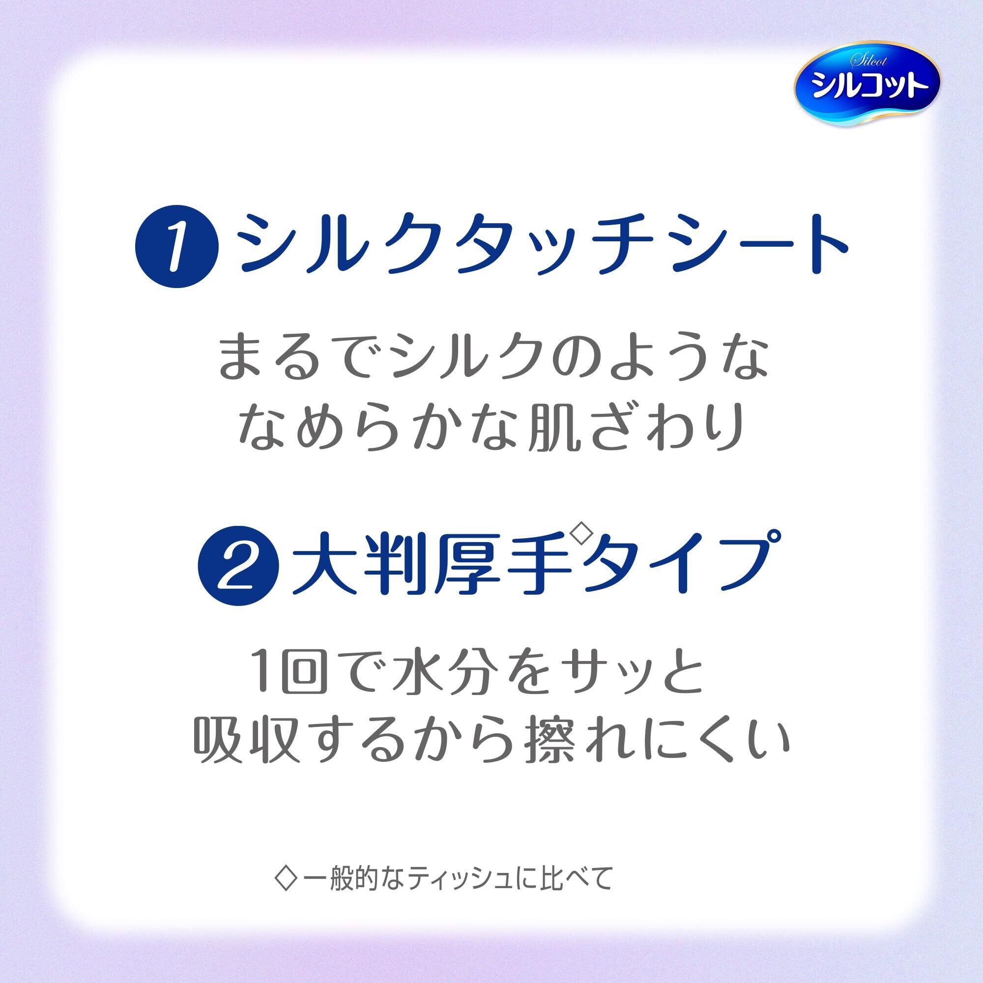 まさつ低減シルクタッチシート*で洗顔後・お風呂上がり後のお顔の水分をやさしくオフ。●大判厚手タイプ(約200mm×200mm)で、1枚で顔全体の水分を、サッと吸収。●シルクのような肌触りのシートで、まさつを低減!*●肌に繊維がつきにくい。*●MADE IN JAPAN。天然コットン・植物由来のレーヨン配合。*一般的なタオルに比べて ユニ・チャーム調べ