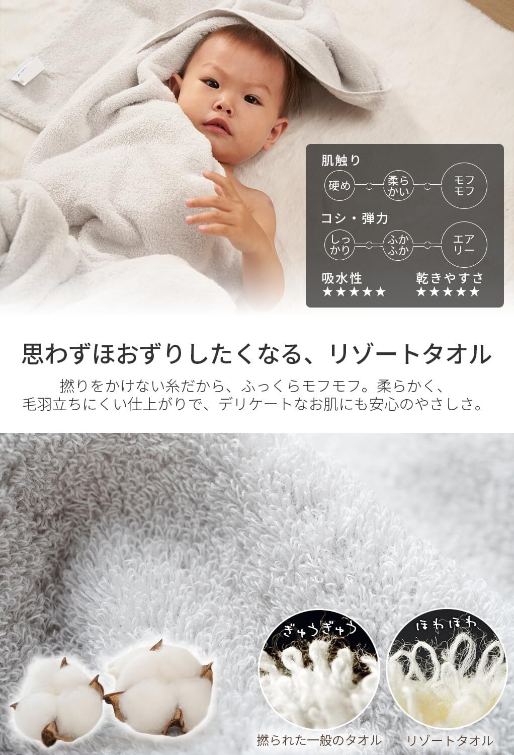 【ふんわり軽やか、肌にやさしい無撚糸】繊維一本一本に撚りをかけない無撚糸製法で、まるで空気をふくんだような“ふわっふわ”の触り心地。ゴワつかず、摩擦を抑えて肌をやさしく包み込みます。敏感肌の方やお子さまにも安心のやさしさ。