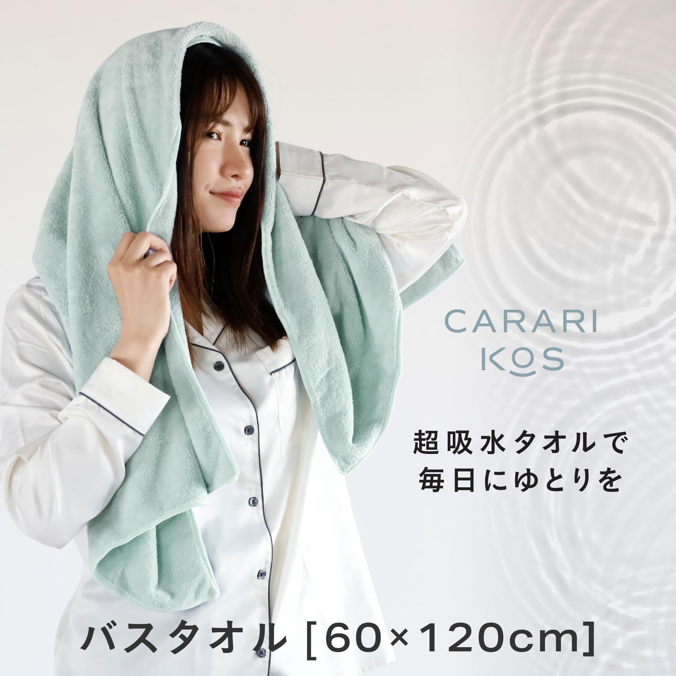 「この『carari バスタオル』で、毎日のバスタイムをもっと快適にしませんか!」/特徴:5倍の吸水力を誇るマイクロファイバー素材を使用したこのバスタオルは、繊維の隙間に素早く水分を吸収し、お風呂上がりのひとときをより快適にサポートします。速乾性にも優れており、気持ち良い使い心地を実現。
