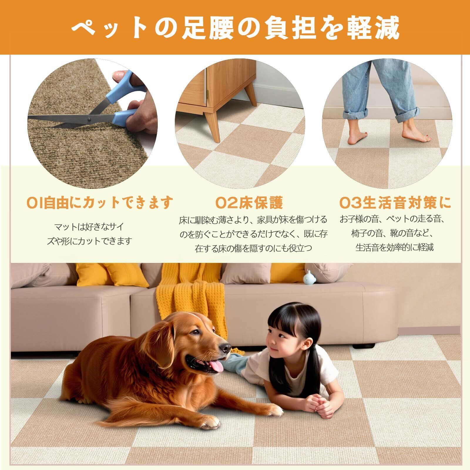 「この『タイルカーペット』で、お部屋に美しさと快適さをプラスしましょう!」/特徴:30x30cmの使いやすいサイズで、リビングやキッチン、寝室に簡単に敷くことが可能。ベージュとオフホワイトの色合いは、さまざまなインテリアスタイルにマッチし、洗練された雰囲気を演出します。