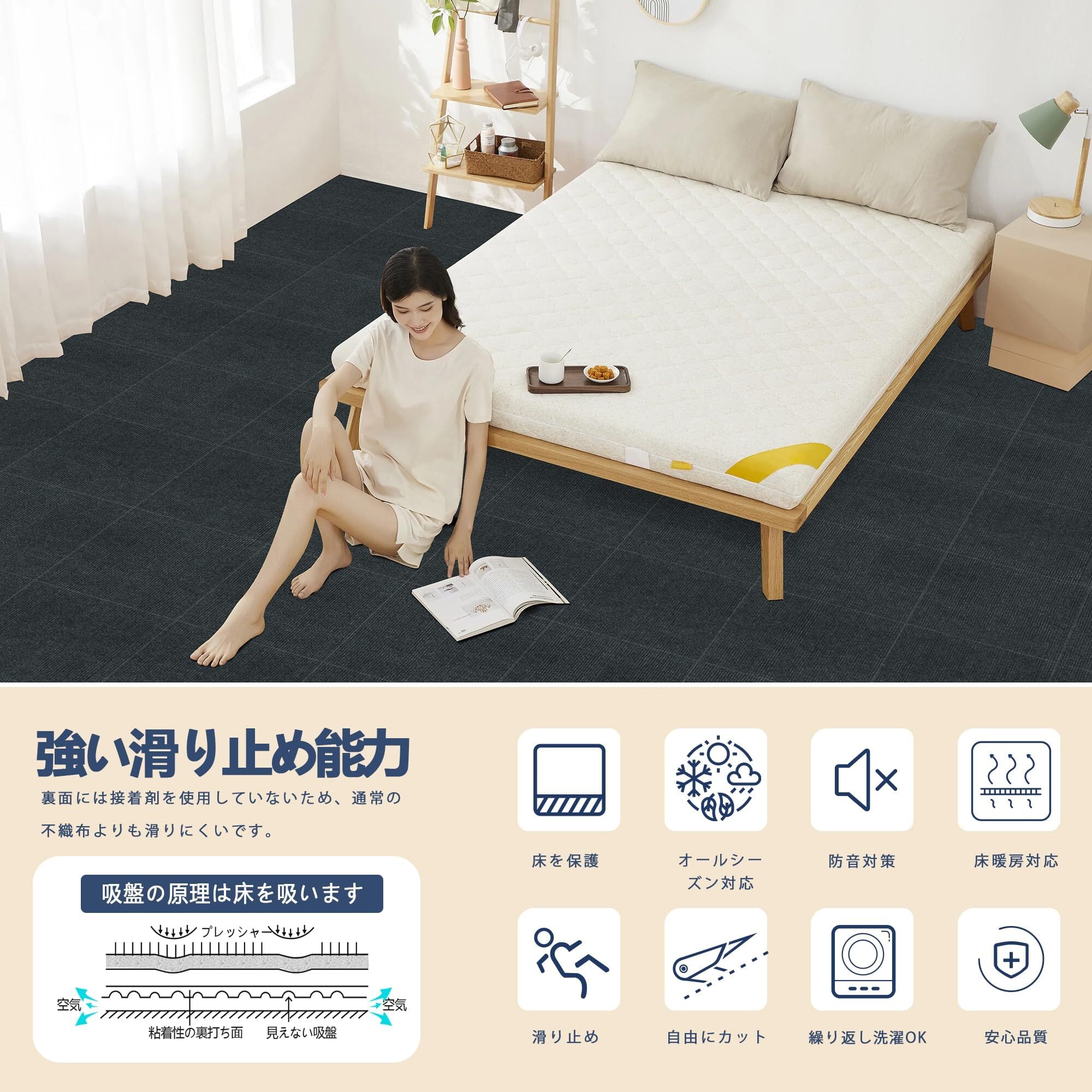 特徴:防音、滑り止め、吸着、洗える、床暖房対応