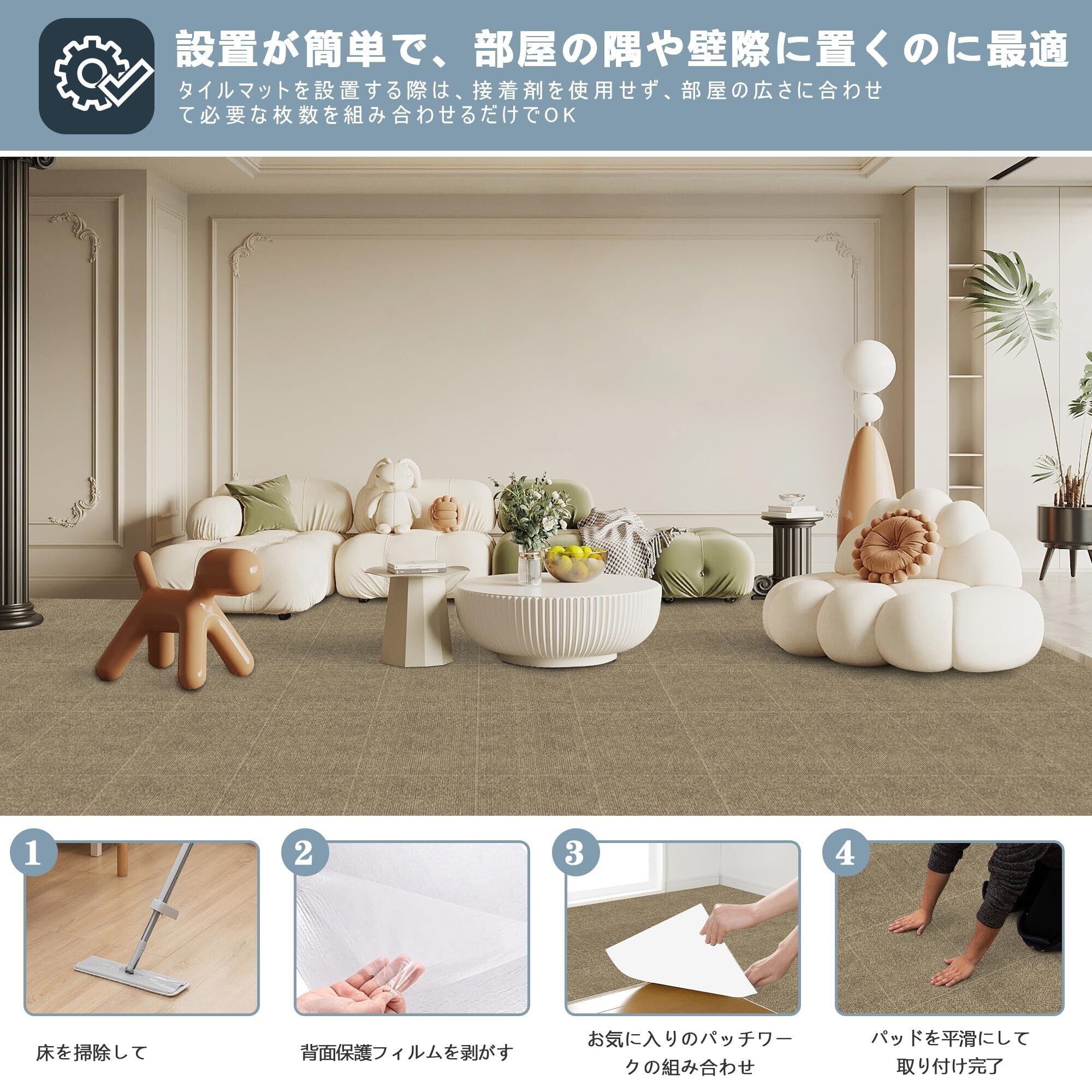 【自由なカットとカスタマイズ】ハサミで簡単にカットできるため、お部屋のサイズや形状に完璧に合わせて自由自在に敷き詰めることができます。色バリエーションも非常に豊富で、お好みに合わせて多彩な組み合わせが可能です。自分だけのオリジナルなインテリアを創り出すことができます。さらに、接着剤などは一切必要なく、簡単に設置できます。部屋の隅や壁際などの場所でもぴったり敷けるので、隙間なく美しく仕上げることができます。