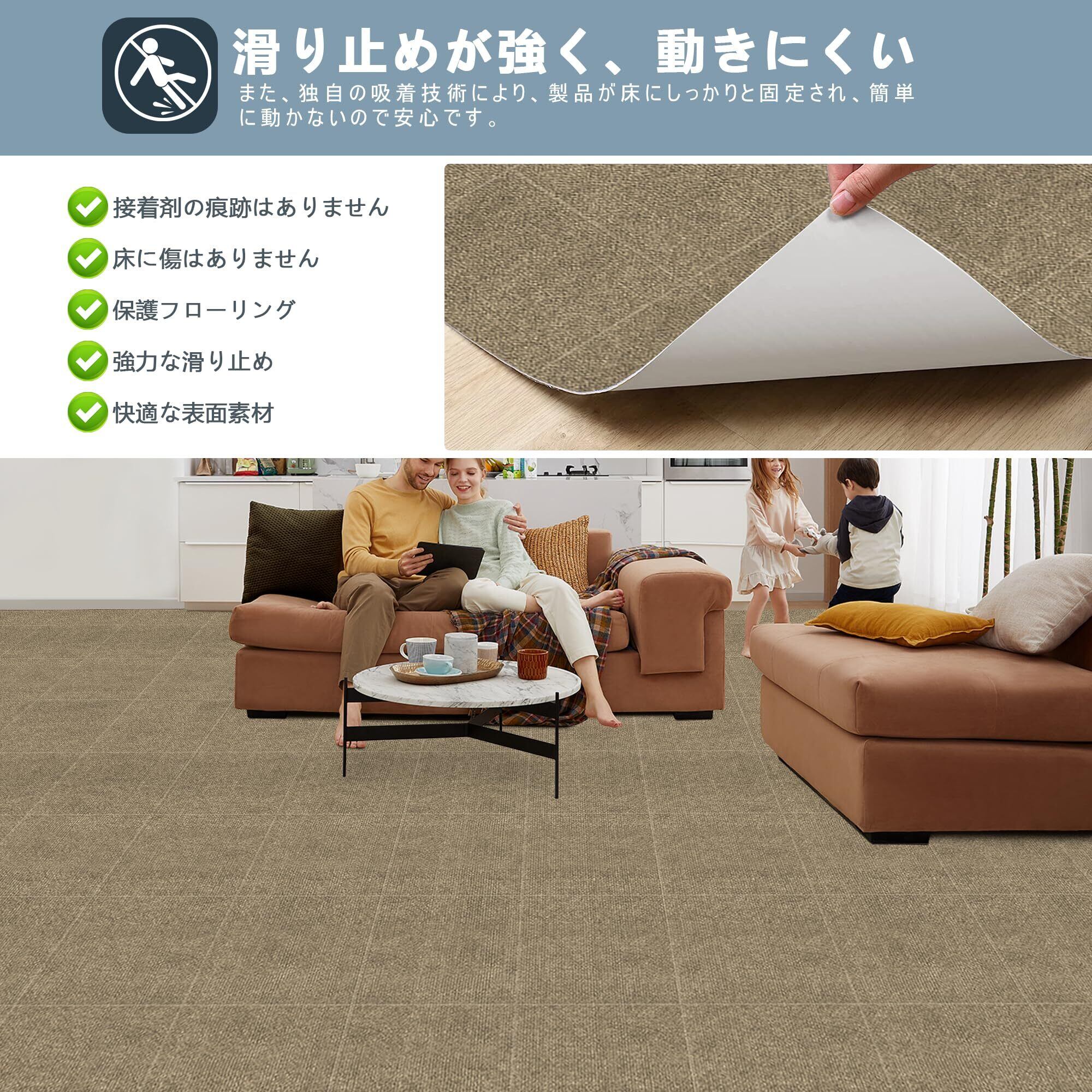【強力吸着と滑り止め】このタイルカーペットは接触面にアップグレードされた TPR 素材を使用し。上を歩いても、掃除機をかけても、驚くほどずれにくく、ストレスを感じさせません。繰り返し使用が可能で、経済的でもあります。長期間使用しても、品質が劣化せず、安定した吸着力を維持します。また、これにより、お部屋の美観を損なうことなく、快適な生活環境を提供します。