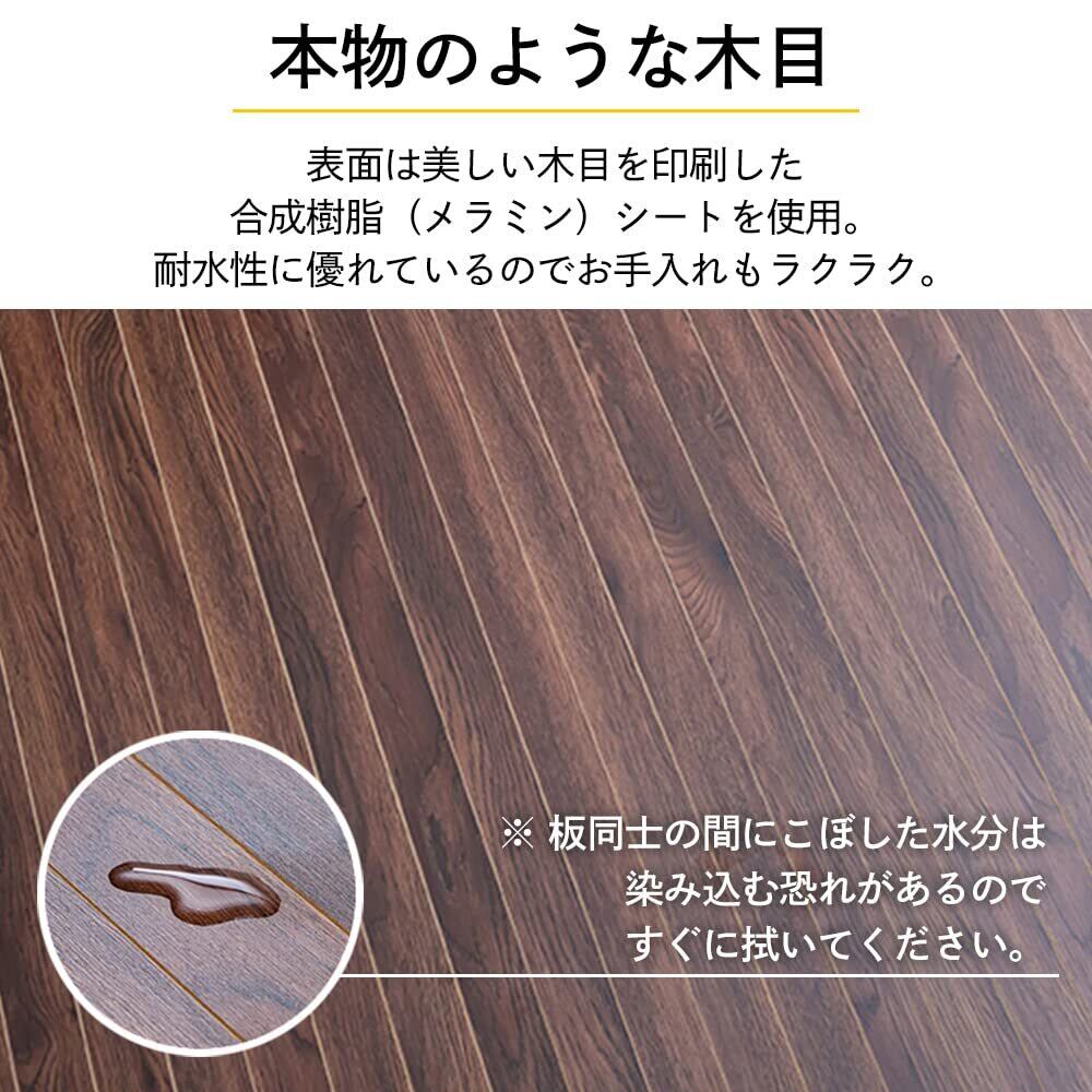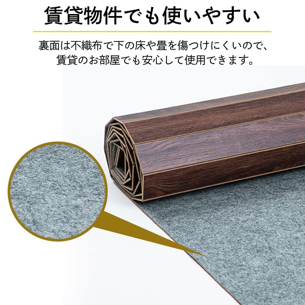 敷くだけでお部屋のイメージチェンジができるウッドフローリングカーペットです。ロール状で届くので、くるくると敷くだけ簡単設置。表面は本物のような木目を印刷したメラミンシートで、耐水性に優れているのでお手入れもラクラク。裏面は床や畳を傷つけにくい不織布を採用しています。中材には丈夫で軽いMDF(中密度繊維板)を使用しています。中央で2分割してあるので、女性一人でも運べます。※カーペットを敷かれる際にジョイント部で手を挟む場合があるため、手袋などのご使用をお勧めします。