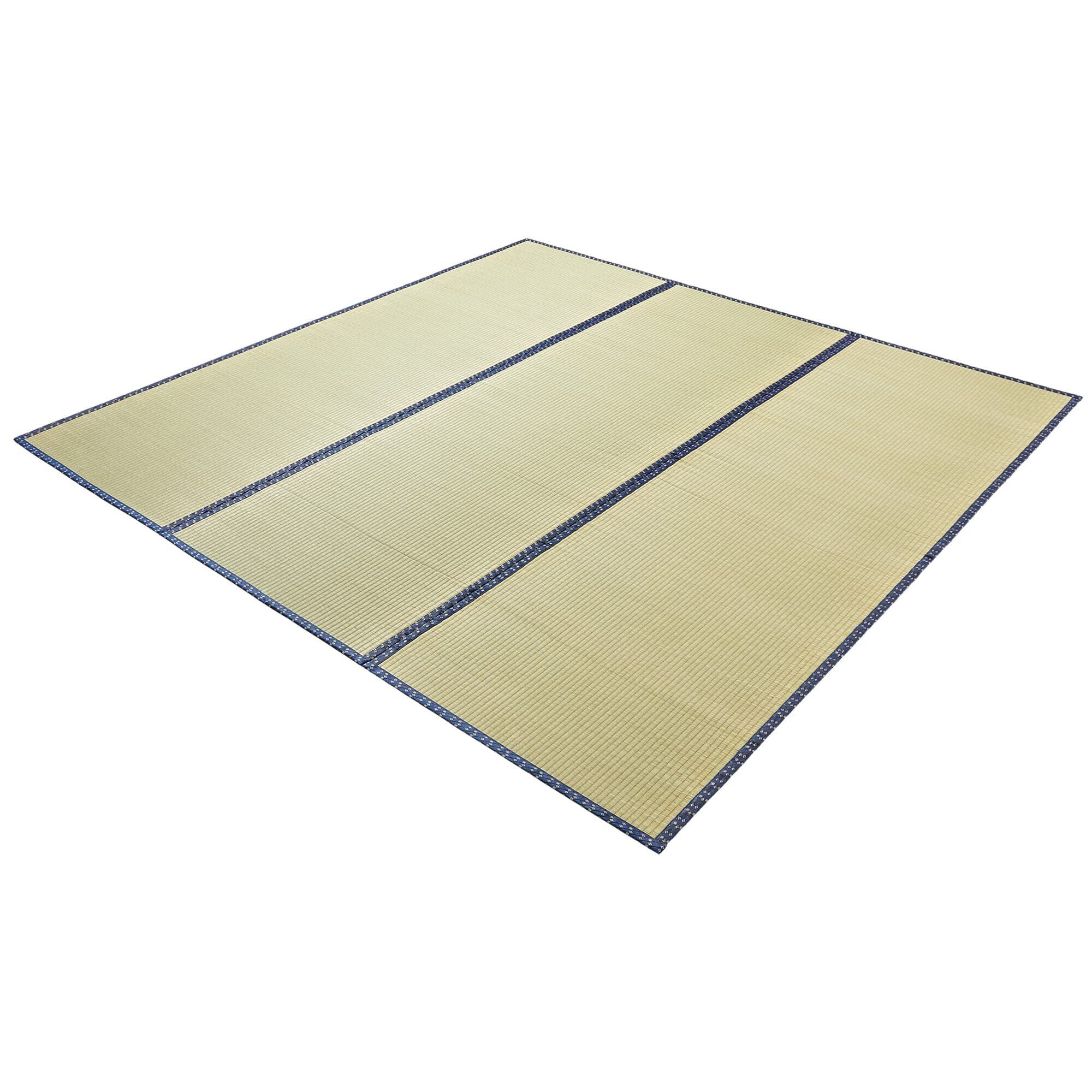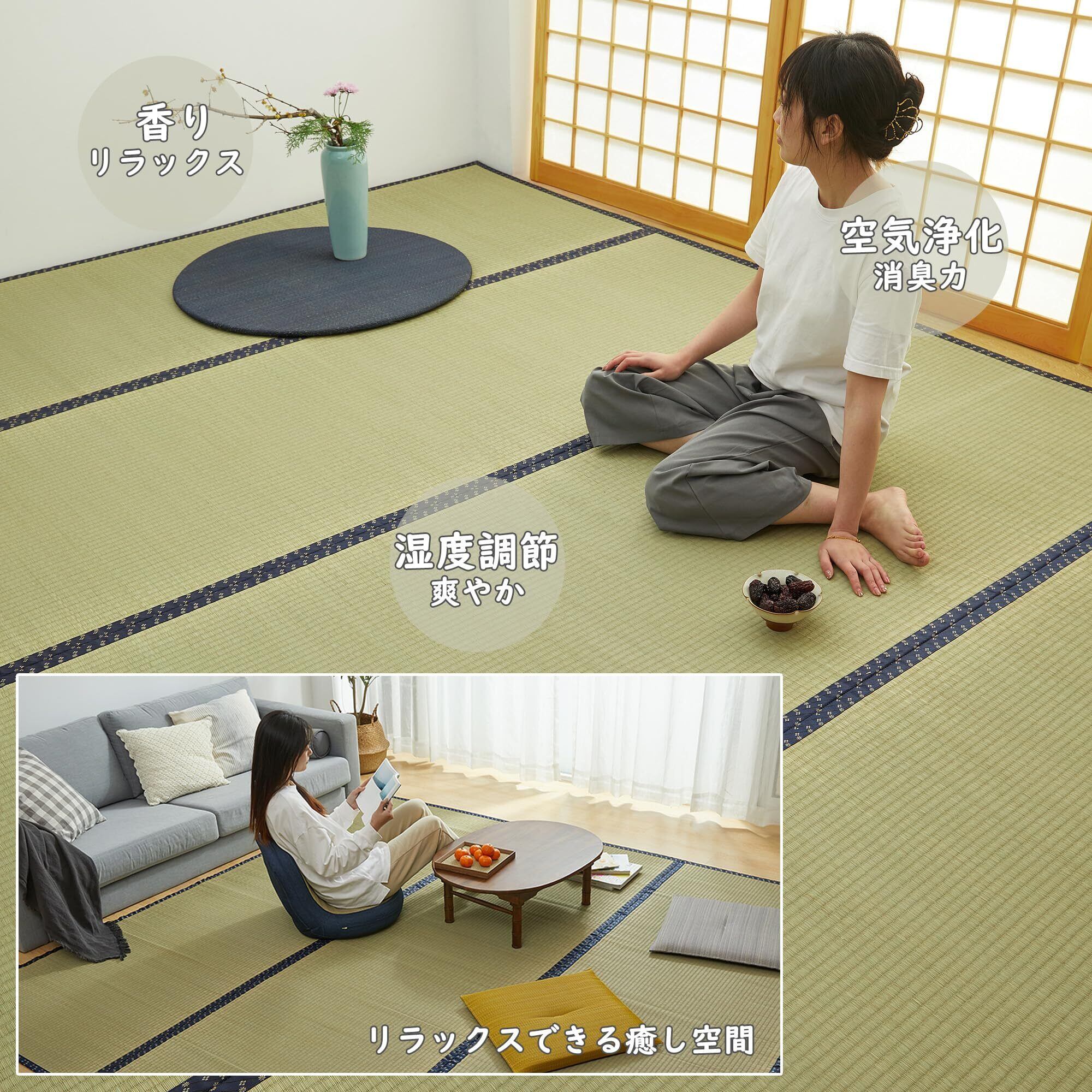畳と同じ織り方の引目織で仕上げられたい草上敷き、い草の打込み本数が多いため丈夫、糸が表に出ないので表面が滑らか、ゴミも溜まりにくいです;厳選したい草を堅実な織技術で優れた品質を実現し、自然の素材感とシンプルな色合いでナチュラルな雰囲気を演出し、インテリアテイストを選ばず、和室にも洋室にも心地よく馴染み、天然素材の魅力を感じさせます。