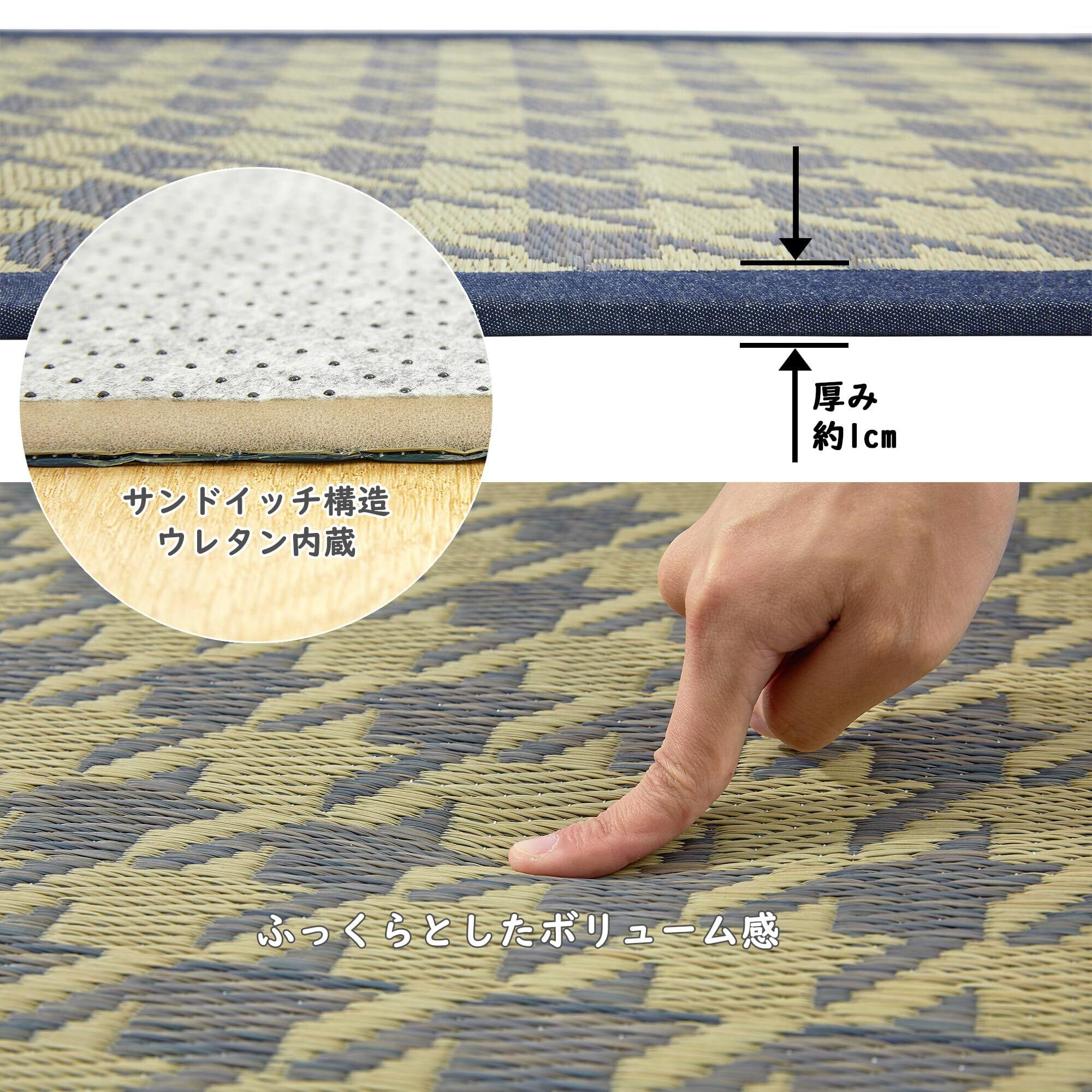 【優れた使い心地】い草は蒸れにくい、ベタつきにくい特性がある上、シーンを問わずいつも爽やか、サラリとした肌触りをキープできます;い草の弾力性と厚さ8mmのウレタンフォームを使用した中材で、素足にほどよいクッション性とボリューム感があり、ふっくらとした踏み心地を楽しめます;ドット樹脂加工を施した不織綿で裏貼りをしており、床を傷つけず、ずれにくく滑り止め効果をUPさせます。