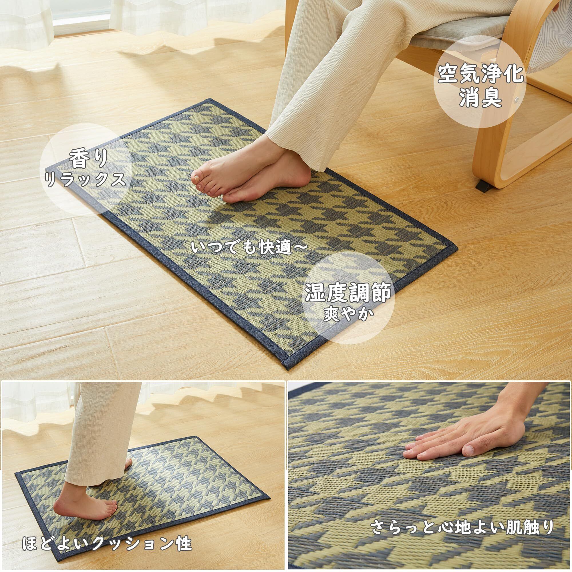 【使い勝手が良い】玄関、ドア、入り口などだけでなく、リビング、キッチン、ベッドルーム、ローテーブルの周辺、ソファーやベッド前の足元など、狭い場所にピンポイントで敷くこともできるため様々な場面で活躍してくれます;また、コンパクトに丸巻きできるため,収納や持ち運びにも便利です;い草は水と汚れが浸透しにくい素材で、拭くだけで簡単に掃除ができるため、お手入れが楽になります。