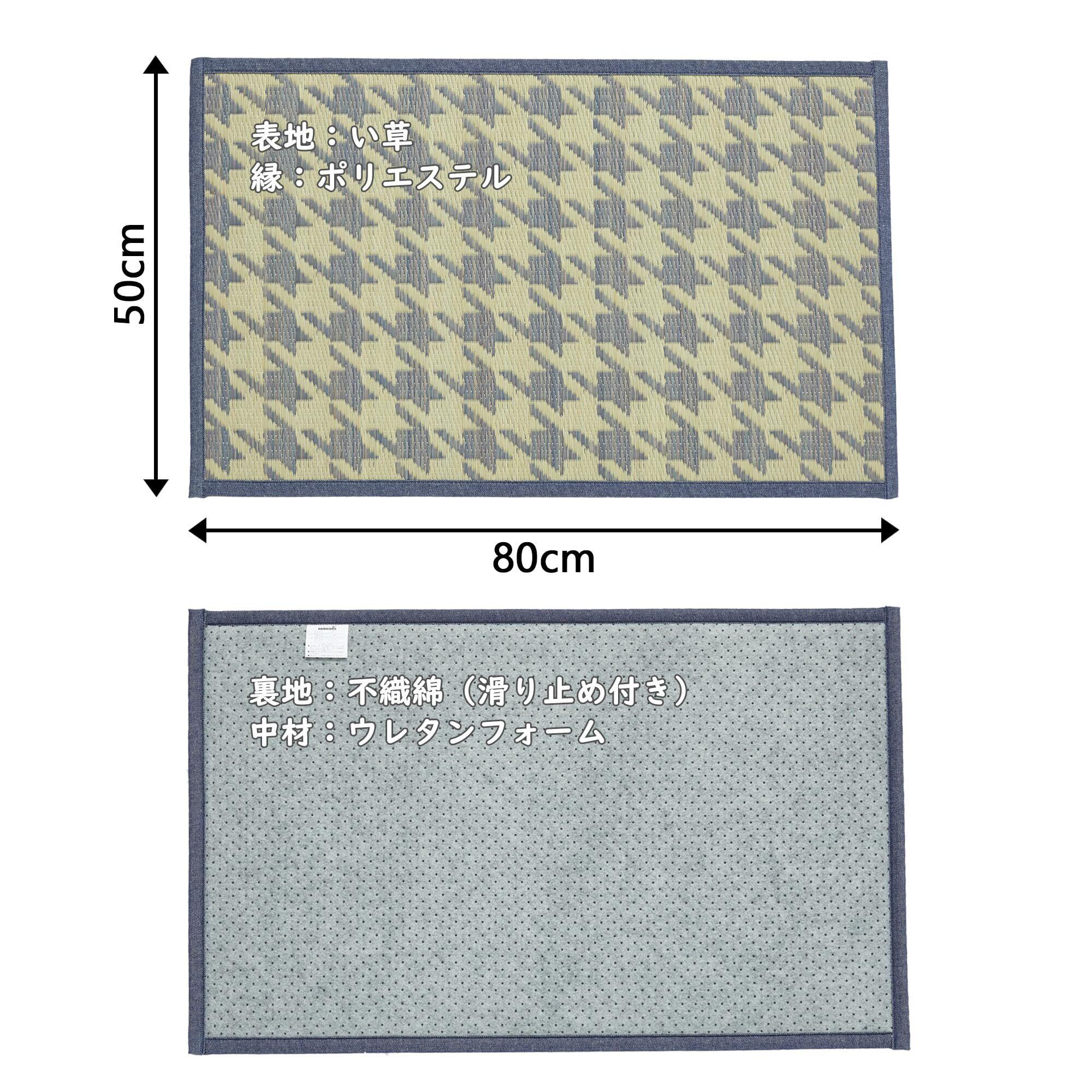 【仕様】サイズ:50x80cm;厚み:約10mm;色:ブルーグレー;表地:い草;中材:ウレタンフォーム;裏地:ポリエステル不織綿(滑り止め付き);縁:ポリエステル;織り方:紋織り;重量:0.6kg;備考:抗菌防カビ処理実施。
