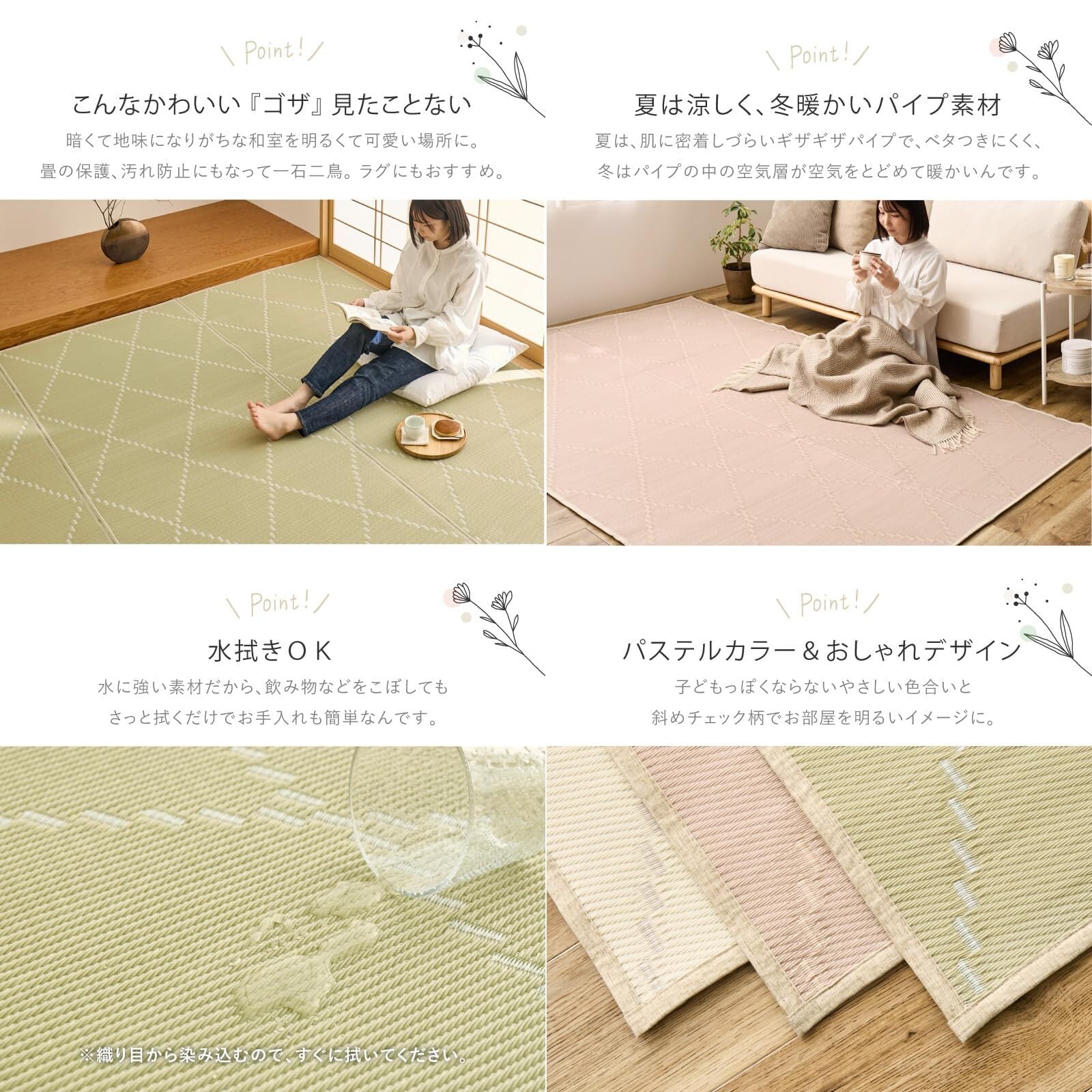 特徴:い草風カーペット、抗菌加工、チェック柄、洗える仕様、子供部屋やペット向け