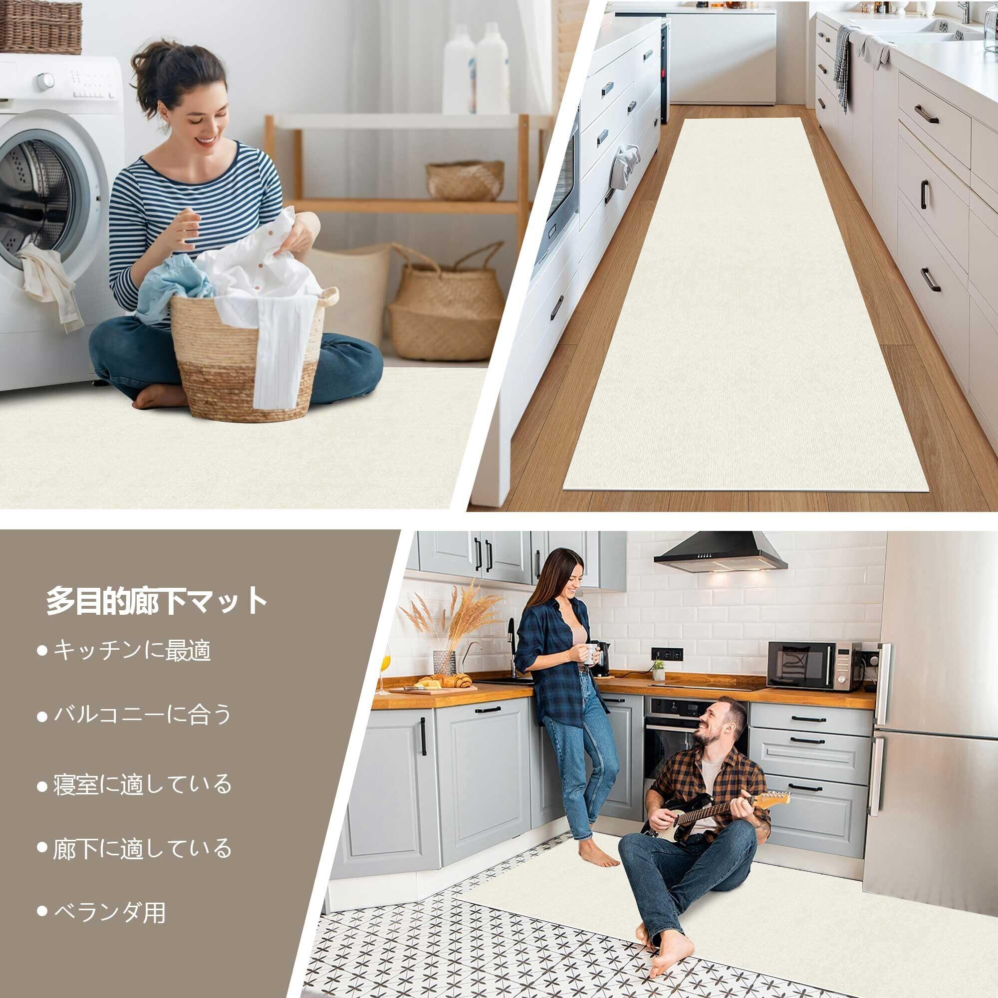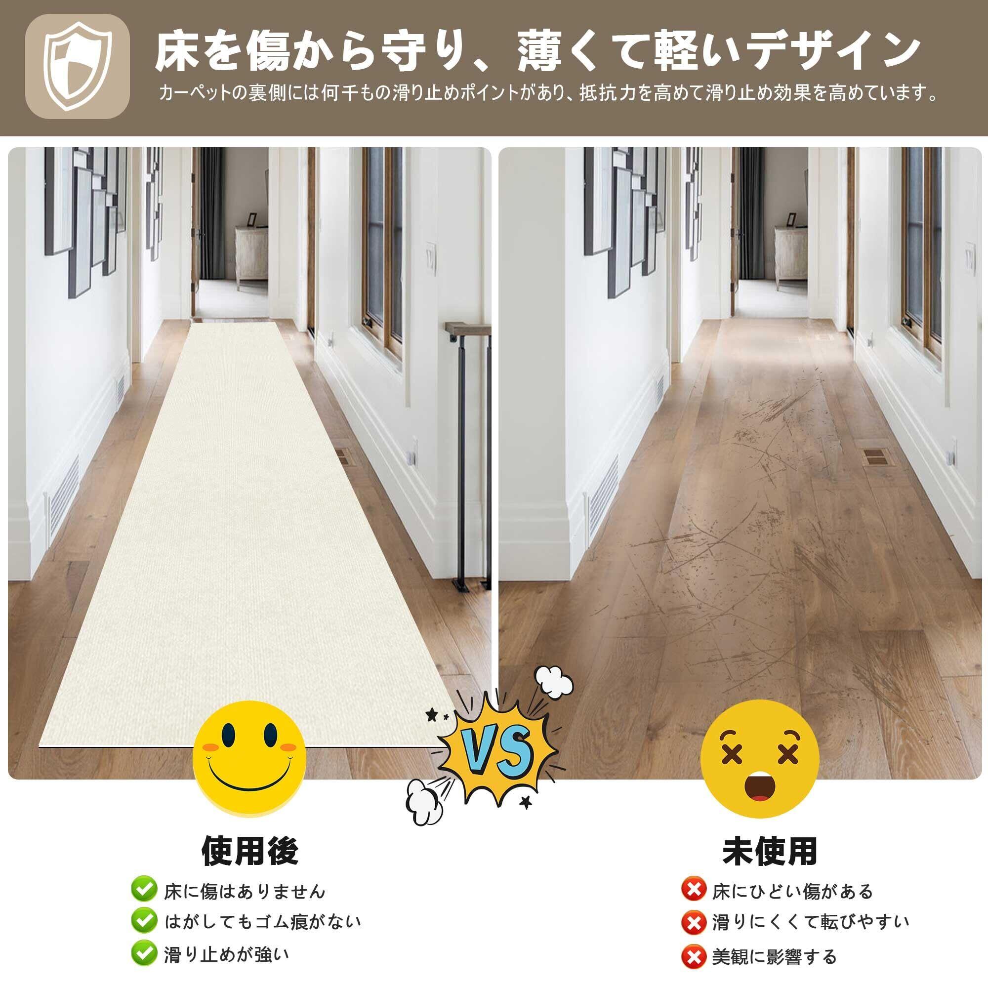 「この『廊下 カーペット XIWEIYI』で、あなたの空間をスタイリッシュで快適に演出しましょう!」/特長:60×300cmのロングサイズは、廊下やキッチン、玄関などさまざまな場所に最適。シンプルでおしゃれなクリームホワイトの色合いが、どんなインテリアにも美しく馴染み、優雅さを演出します。
