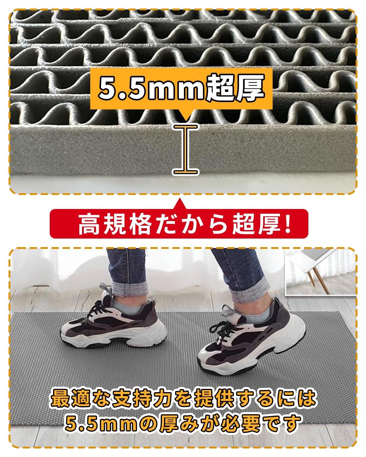 【耐摩耗性・耐老化性】:この滑り止めゴムマットは環境に配慮したPVC素材を使用し、防水性、紫外線耐性、耐摩耗性に優れています。無臭で、快適な足触りを提供し、長時間の立ち仕事や歩行による疲れを軽減します。耐老化設計により色あせを防ぎ、日光や長期使用による老化を防止し、寿命を延ばします