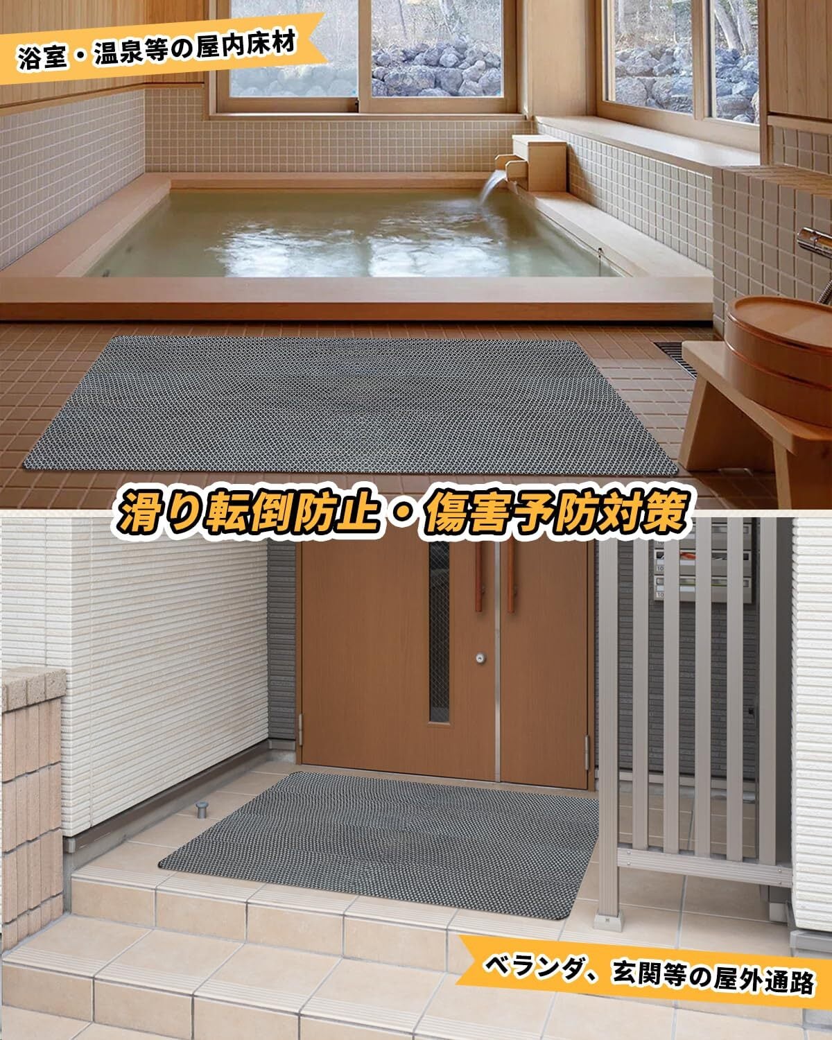 【転倒・滑り防止】:この滑り止めマットは、湿気や滑りやすい場所での転倒を防ぐために設計されています。マット全体がS字型のハニカム構造を持ち、浴室やプールサイドなどでも優れた滑り止めテクスチャーにより安定したグリップを提供し、滑りのリスクを回避します。防滑係数テストをクリアしており、木製デッキ、濡れた木の床、玄関、出入口周辺、傾斜のある滑りやすい場所、タイル、コンクリート、石材の床、金属板、格子状の床など、様々な地面で効果的に滑り止め効果を発揮します