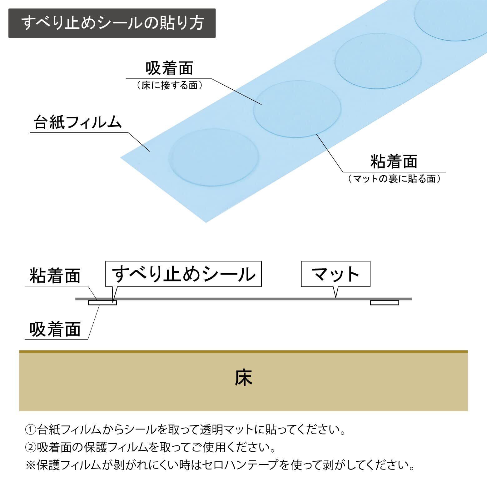 ・透明マット専用のすべり止めシールです。透明マットの裏側には【粘着面】を貼り、テーブルや床側に【吸着面】を貼り付けてご使用ください。
