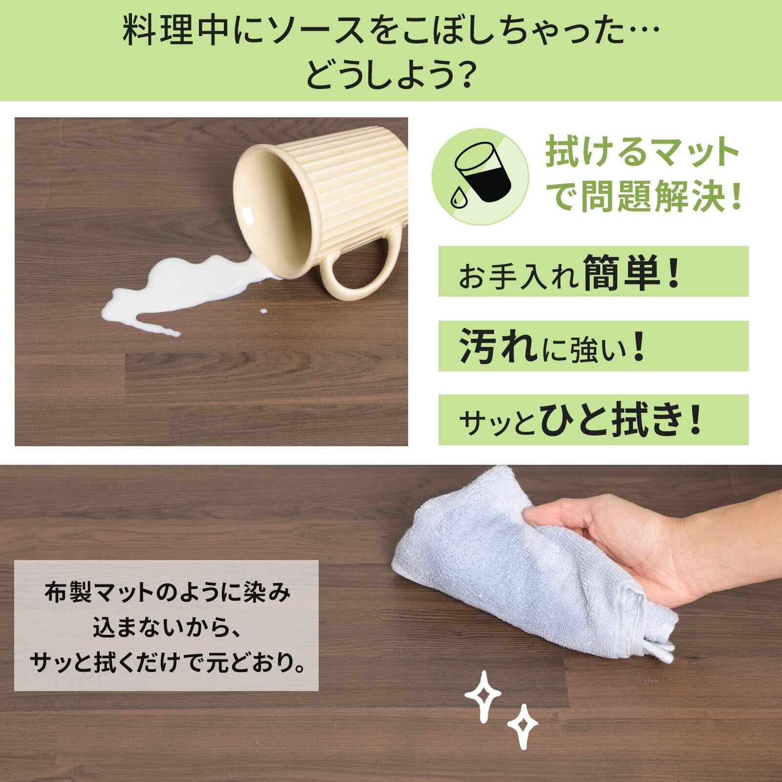 高品質なPVC素材に撥水加工が施されており、水や油がこぼれた際でもサッと拭くだけでOK。汚れが染み込まず、手間いらずのお手入れが可能です。忙しいキッチンでも簡単にきれいに保てます。