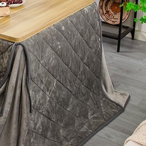 「心地よく暖かな『テーブル用こたつ布団』で、冬のひとときをより快適に過ごしてみませんか!」/特長:約240x295cmの大きさは、ダイニングテーブルに最適で、広々としたスペースを確保。ダークグレーのシンプルなデザインは、どんなインテリアとも調和し、温かみのある空間を演出します。