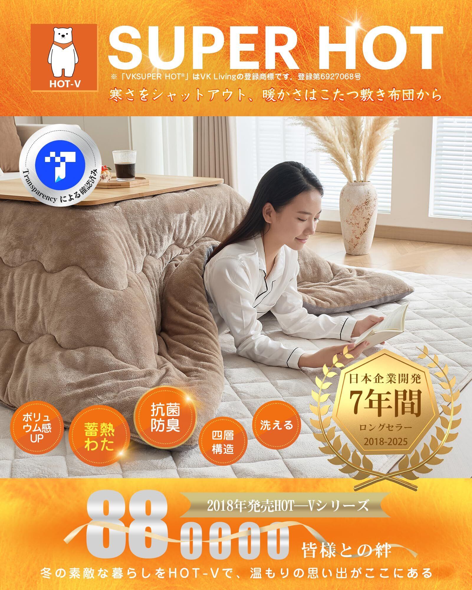 「冬の居心地よい空間を演出する『VK Living こたつ敷き布団』で、温かさとおしゃれを楽しんでください!」/特長:190×240cmのサイズは、標準的なこたつにぴったりフィット。ふんわりとしたマイクロファイバー生地が心地よい触り心地を実現し、冬のインテリアに安らぎをもたらします。