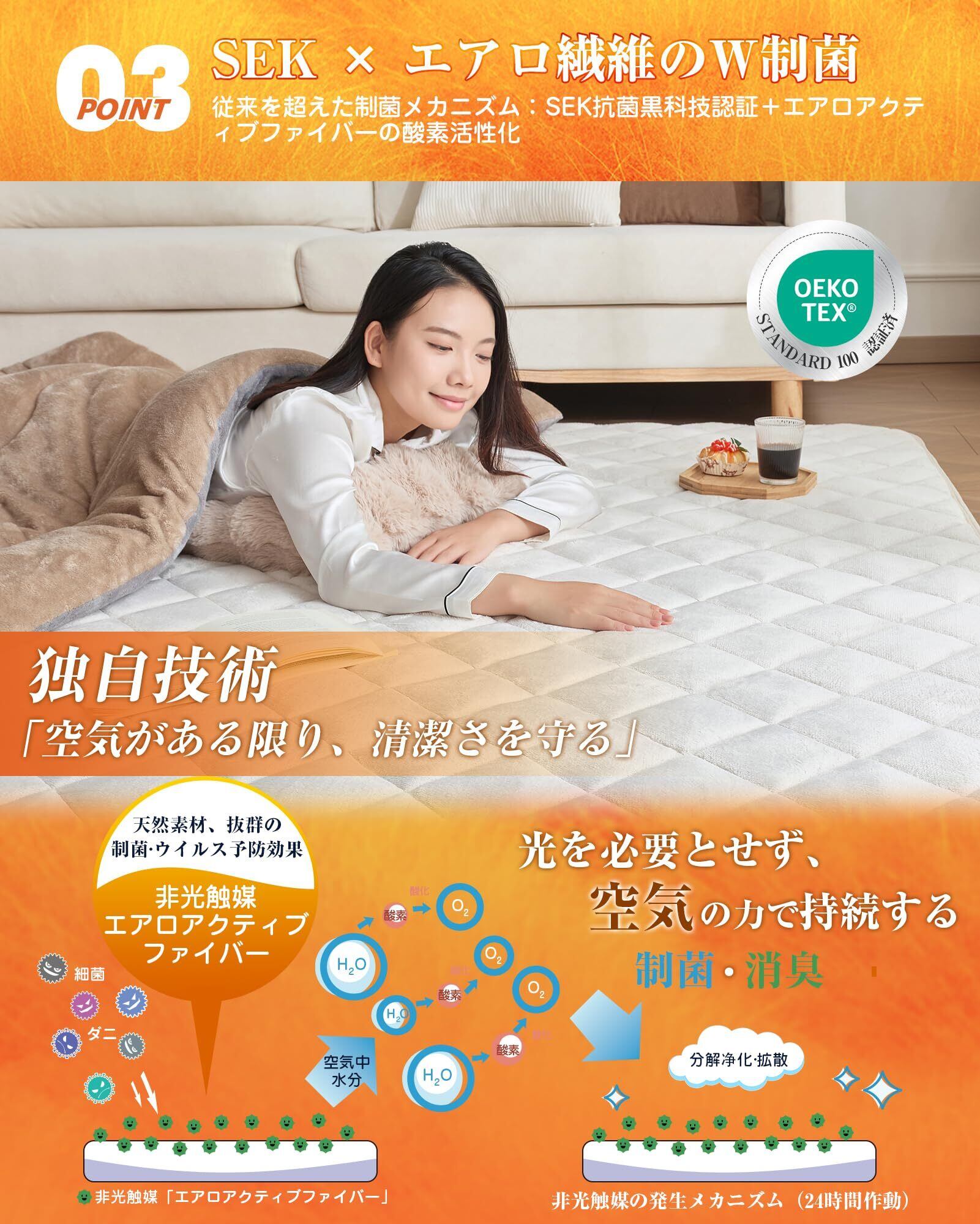 【非光触媒のW制菌】非光触媒の酸素活性化で、空気がある限り、24時間持続的に制菌消臭作用を発揮する。低ホルムアルデヒドなのでお子様にも使えます。洗濯しても抗菌防臭・防ダニ効果は持続します。