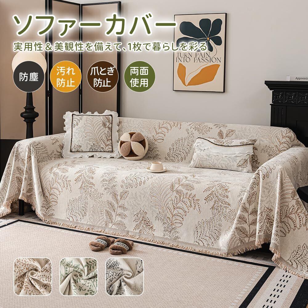 「スタイリッシュで機能的な『ソファーカバー』が、あなたのリビングを一新します!」/特長:このマルチカバーは、90x180cmの大判サイズで、1人掛けソファにぴったり収まるデザイン。北欧風の植物柄は、ナチュラルでおしゃれな雰囲気を演出し、どんなインテリアにも調和します。