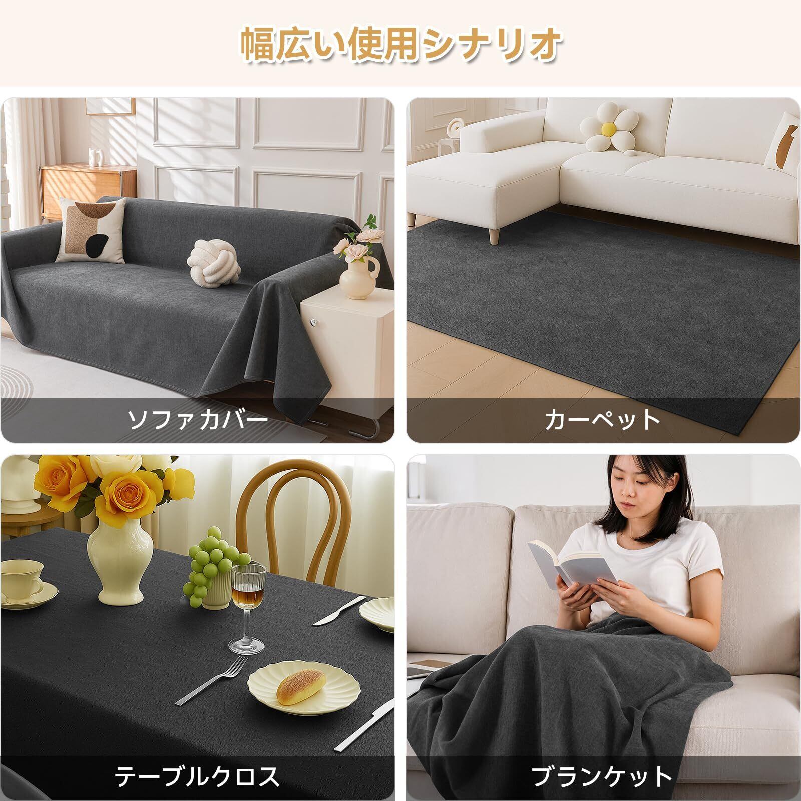 このカバーはソファーカバーだけではなく、背景としても使えるため、テーブルクロスやアウトドアのシートとしても活躍します。様々なシーンで活用できる多用途性を備えており、生活シーンを彩ります。