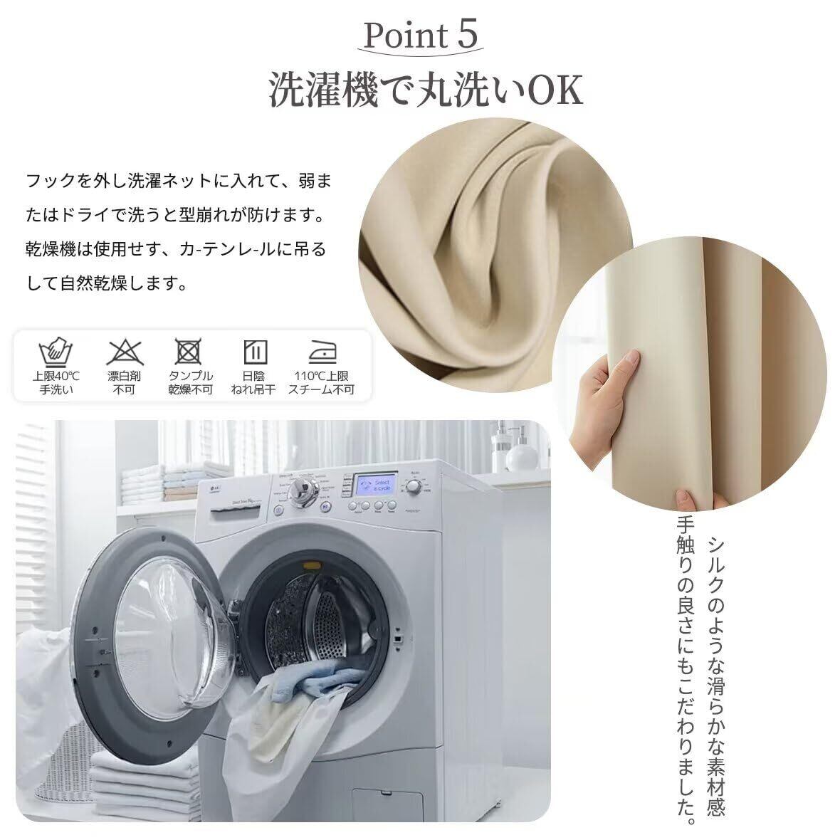 【高密度で熱移動を抑えて断熱効果も】:高密度な生地で熱や冷気を通しにくく断熱効果も。冷暖房効率UP・節電にも繋がる。