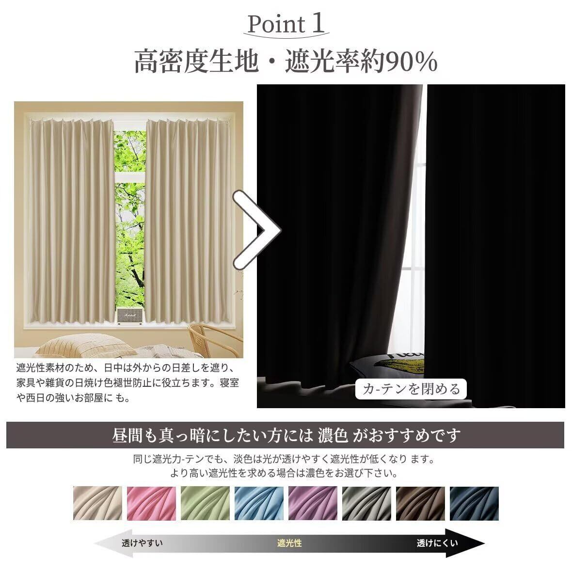 【遮光カーテン】遮光率約90%。黒い遮光糸を三重織り込むため、日差しや紫外線などをしっかり遮られる機能付きの厚地カーテンです。(遮光性は暗いの方うが顕著です。)