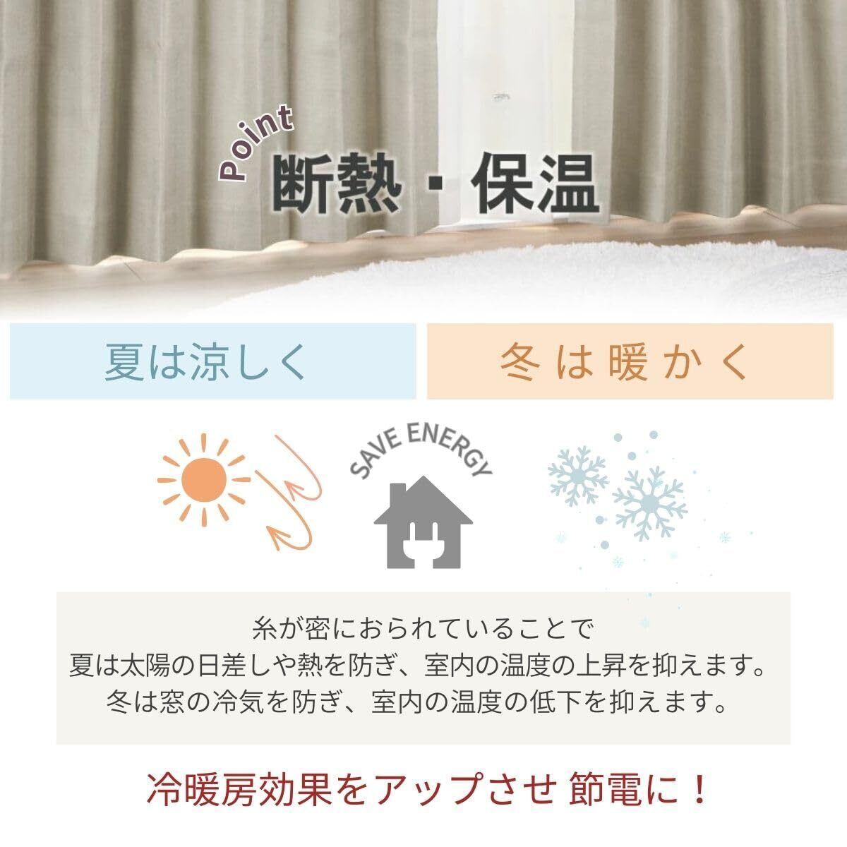 日本製/アジャスターフック付き(Bフック)/タッセル付き(カーテン1枚につき1本付いています)/※1級遮光(遮光率99.99%以上)の生地を使用していますが完全遮光(遮光率100%)ではなく色の濃淡により遮光性が異なります/※150幅以上は左右どちらかにジョイント(つなぎ目)が入ります/断熱効果率56.4%、保温効果率33.8%