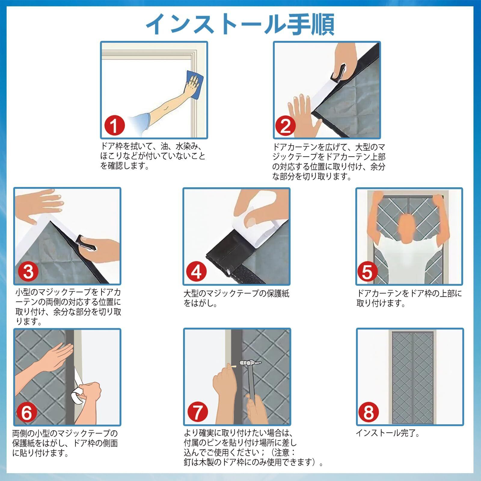 【特別な注意】1.このドアカーテンの実際のサイズは幅90*高さ200cmで、最大86 x196cmまでのドアサイズに適合します。ご購入前にドアの幅と高さを測ってください;2.このドアカーテンは、木材、金属、タイルなど、滑らかな表面のドア枠にのみ適しています。表面が粗い、または凹凸のあるドア枠や壁には貼り付けないでください。そうしないと簡単に剥がれてしまいます。