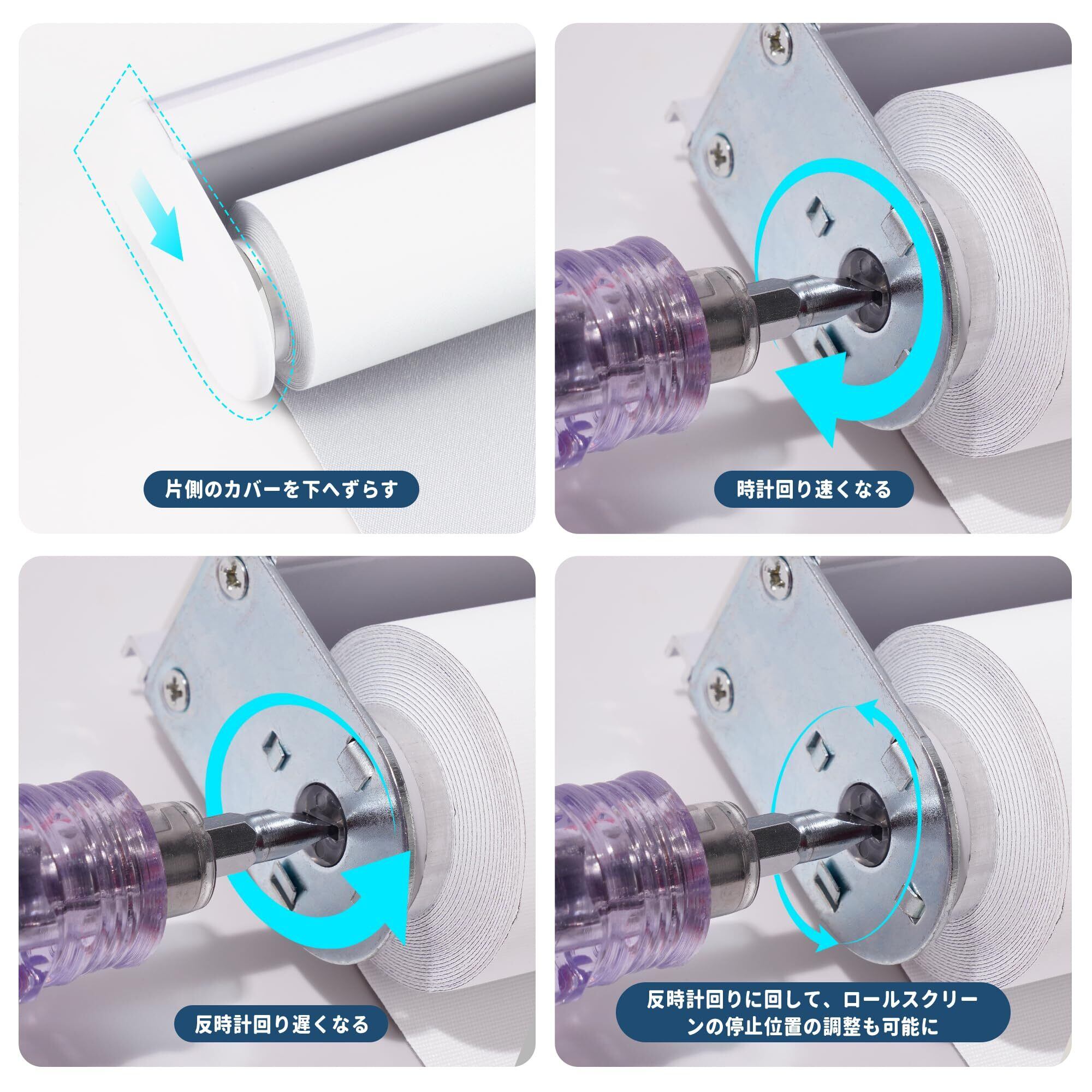 [プルコード式&巻き上げ速度の調節可能]プルハンドルを軽く下方向に引き、手を離すと、ロールスクリーンが自動的に上がります。下方向に引き下げてから手を離すと止まります。ロールスクリーンの巻き上げ速度はダイヤルで簡単に調整できます。時計回りに回すとバネが緩み、駆動力が小さくなり、引き下げ力が弱くなるため、ロールスクリーンの巻き上げ速度が遅くなります。反時計回りにダイヤルを回すとバネが締まり、駆動力が強くなり、引き下げ力が強くなるため、ロールスクリーンの巻き上げ速度が速くなります。