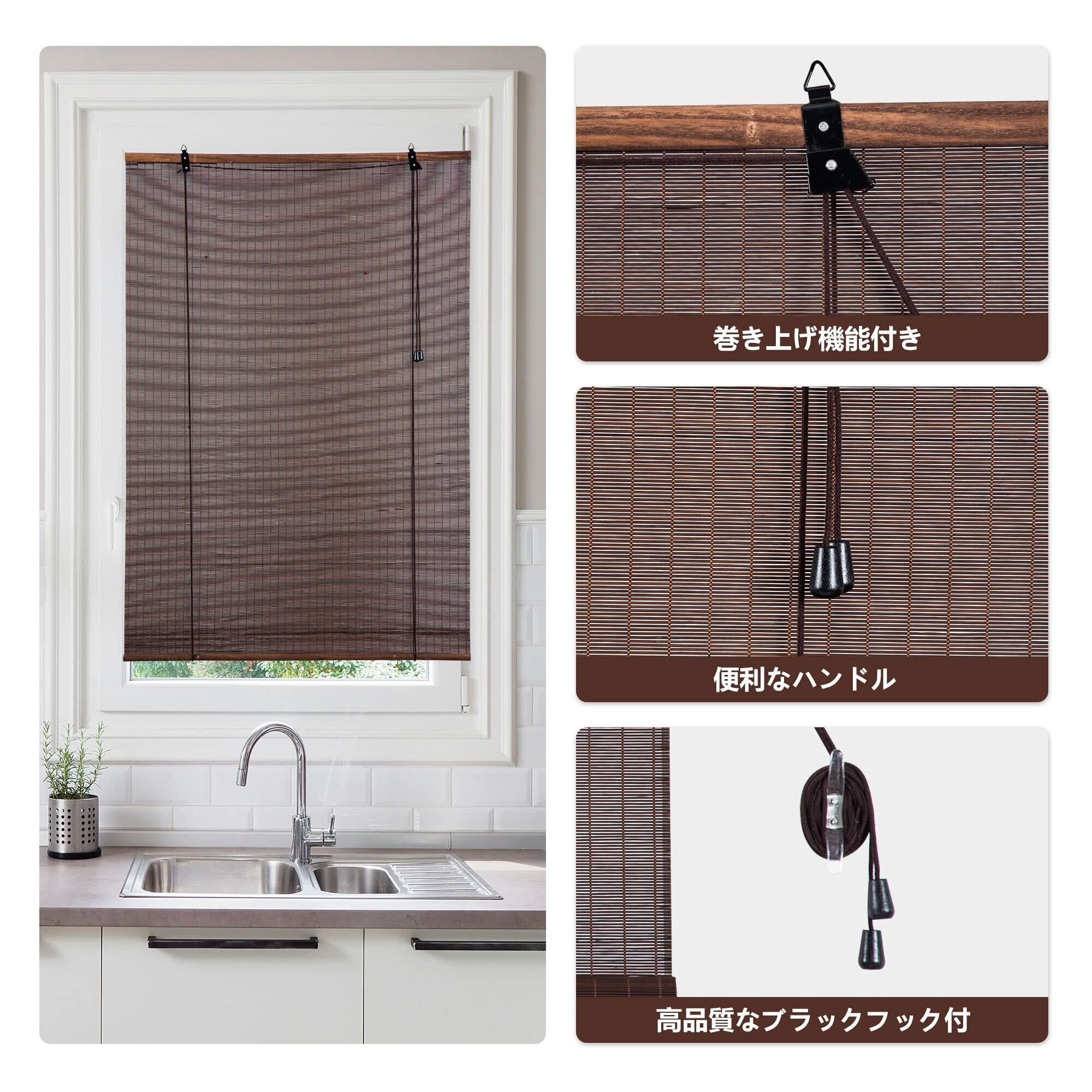竹すだれ 2本セット ダークブラウン 幅88cm×丈170cm 竹ロールスクリーン 簾 屋内 竹ブライド 巻き上げ機能 目隠し 遮光 遮熱 日除け 日よけ防止 風通し 和風 和室 コード用フック付き