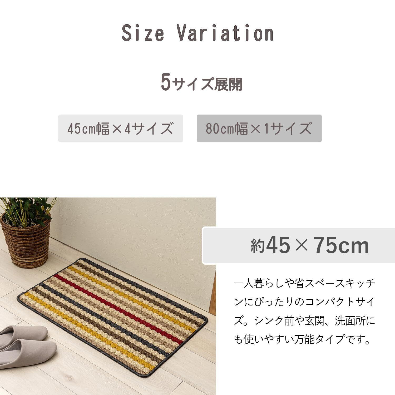 ■どんなお部屋にも合わせやすい、おしゃれなデザインマットです。さりげない織り柄が上品な印象のシンプルなデザインで、木目調の床や北欧風のインテリアとも相性が良く、季節を問わずお使いいただけます。 ■ぴたっとズレにくいノンスリップ加工。裏面にはエチレン系樹脂で滑り止め加工を施しています。すべりにくく、丈夫で、洗濯を繰り返しても劣化しにくい素材です。 ■ご家庭の洗濯機で丸洗いOK。こまめに洗えて、いつでも清潔に保つことができます。 ■一人暮らしや省スペースキッチンにぴったりのコンパクトサイズ。シンク前や玄関、洗面所にも使いやすい万能タイプです。