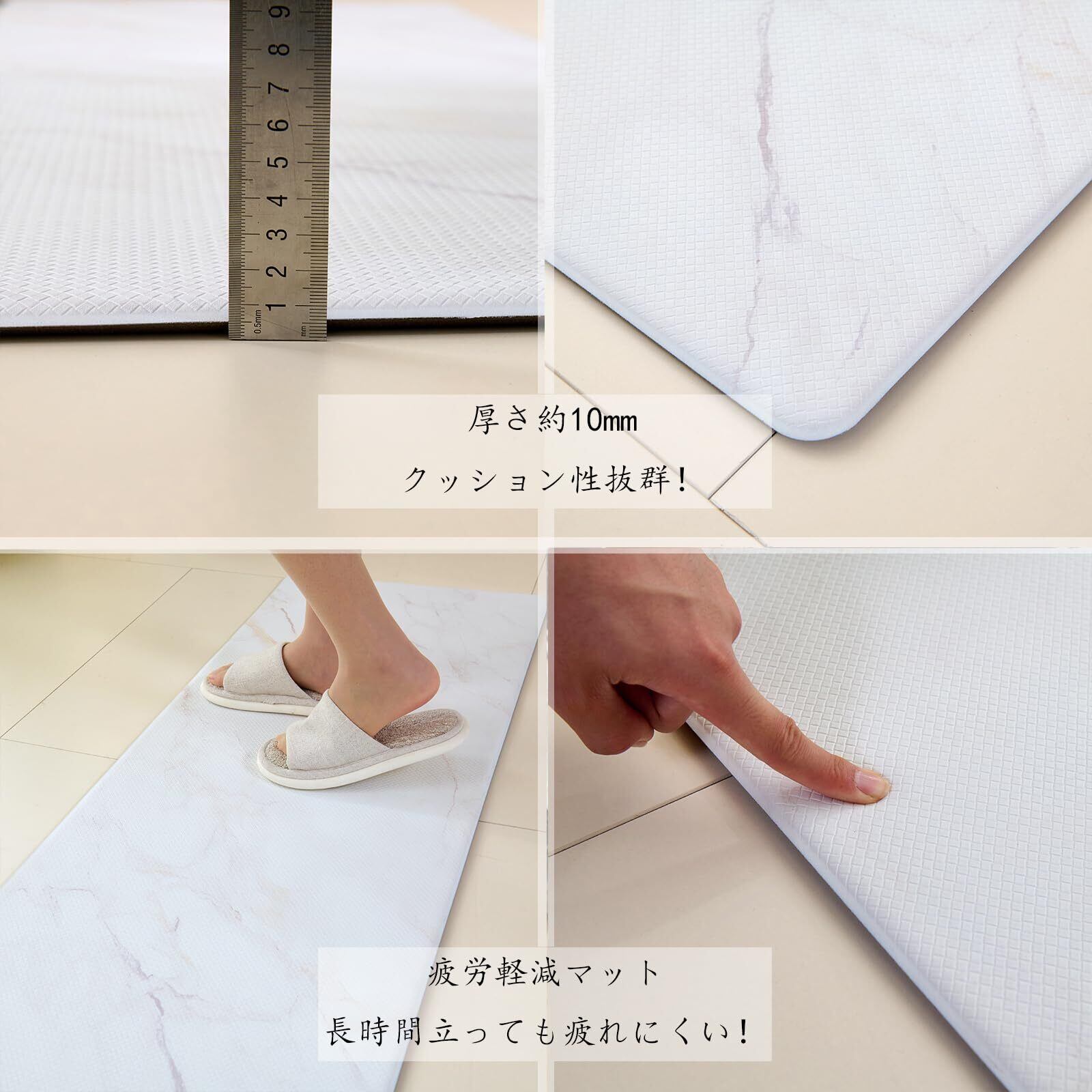 【厚さ10mmのクッション構造】 適度なクッション性で足への負担を軽減。長時間の立ち仕事にも疲れにくく、快適なキッチンタイムをサポートします。
