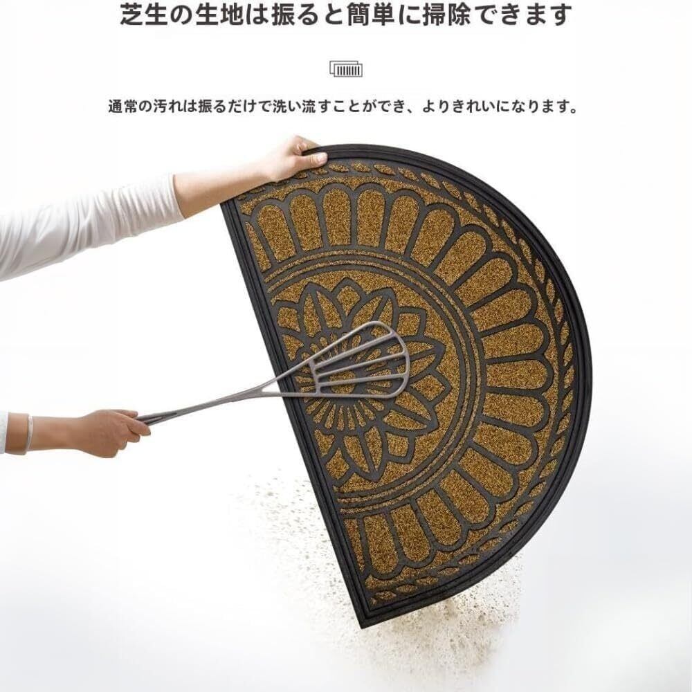 サイズは 60cm×90cm の最適寸法で、一般的な玄関やエントランスのスペースにぴったり収まります。半円の形状が直線的な建物の外壁やドアと調和し、空間に柔らかな印象を与えます。用途は玄関の出入り口に限らず、ベランダの入口やガレージの出口など屋外のさまざまな場所に設置でき、コンパクトなサイズでありながら十分な面積を確保しているため、複数人が同時に使用しても効果的に泥を落とせます。