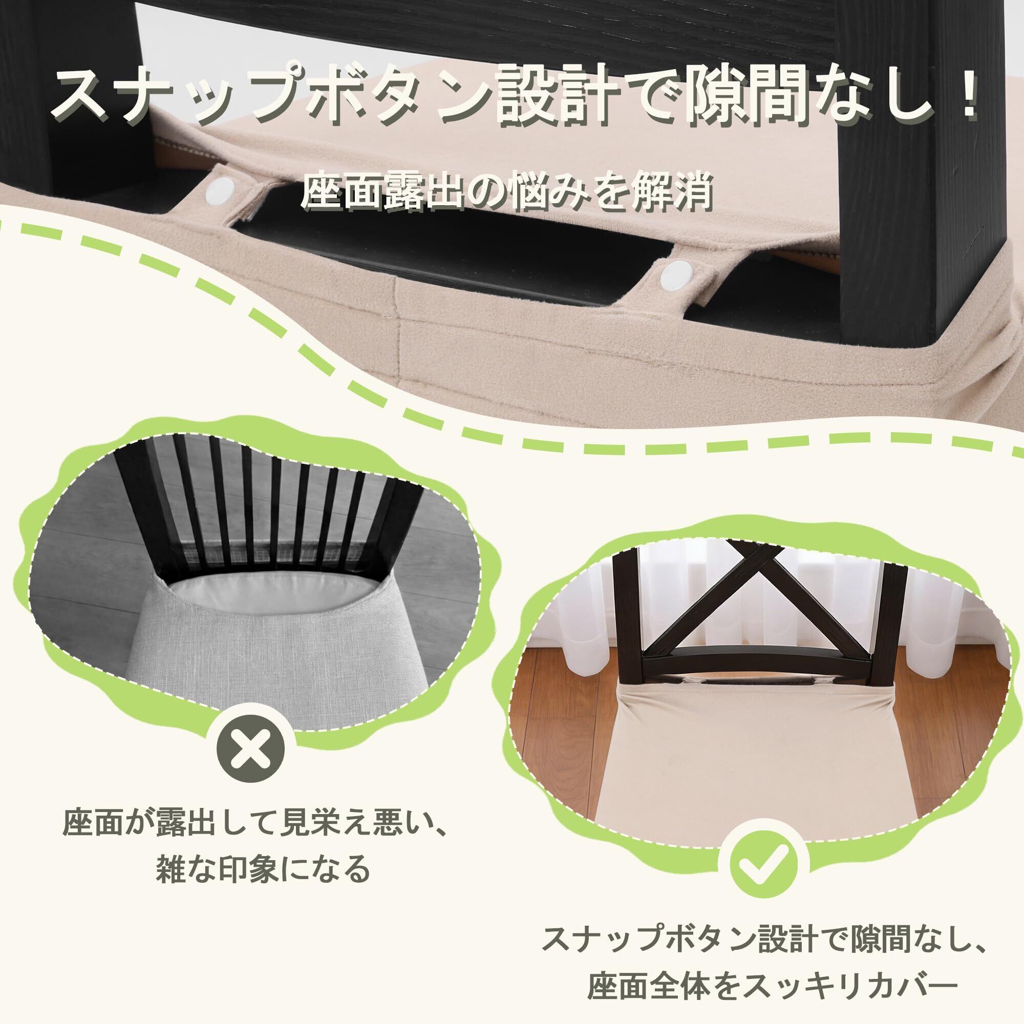 【プラスナップボタン設計】普通のカバーを改良して、背もたれの部分にボタンをつけました!以前は背もたれ側から椅子の元の表面が見えちゃう問題がありましたが、これで完全に隠せるようになります。ボタンでちょっと固定するだけで、見た目がすっきりまとまるので、お部屋の雰囲気も統一されて、きれいに見えるようになります