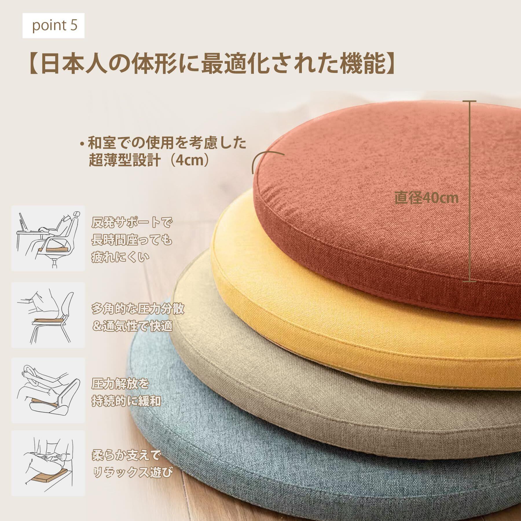 【日本人の体形に最適化された機能】 和室での使用を考慮した超薄型設計(4cm) お尻の形にフィットするくぼみ加工 「本物のメモリーフォーム証明 クッション表面に時々見られる小さな気泡穴は、高温発泡成形時に素材が呼吸した自然な痕跡。一つ一つ職人が温度を見極めながら仕上げた証であり、耐久性や快適性に影響はございません。 むしろ通気性を高め、夏場の蒸れを軽減する機能美とも言えます。