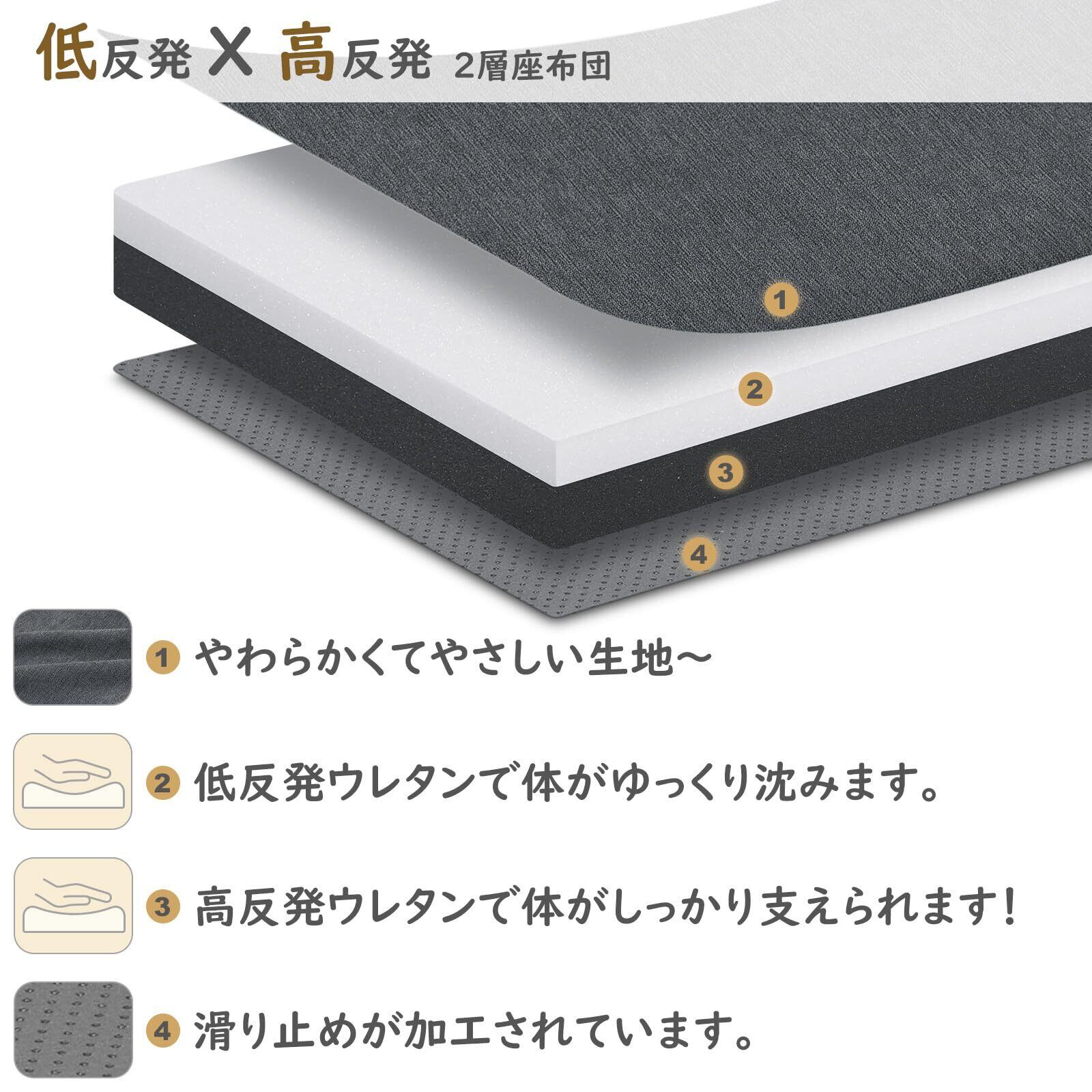 【2層構造】2cm低反発ウレタン+3cm高反発ウレタンの2層構造で5cmの薄さでよい座り心地をあたえ、長時間使用してもへタレにくく、2つの素材の長所を生かしました。