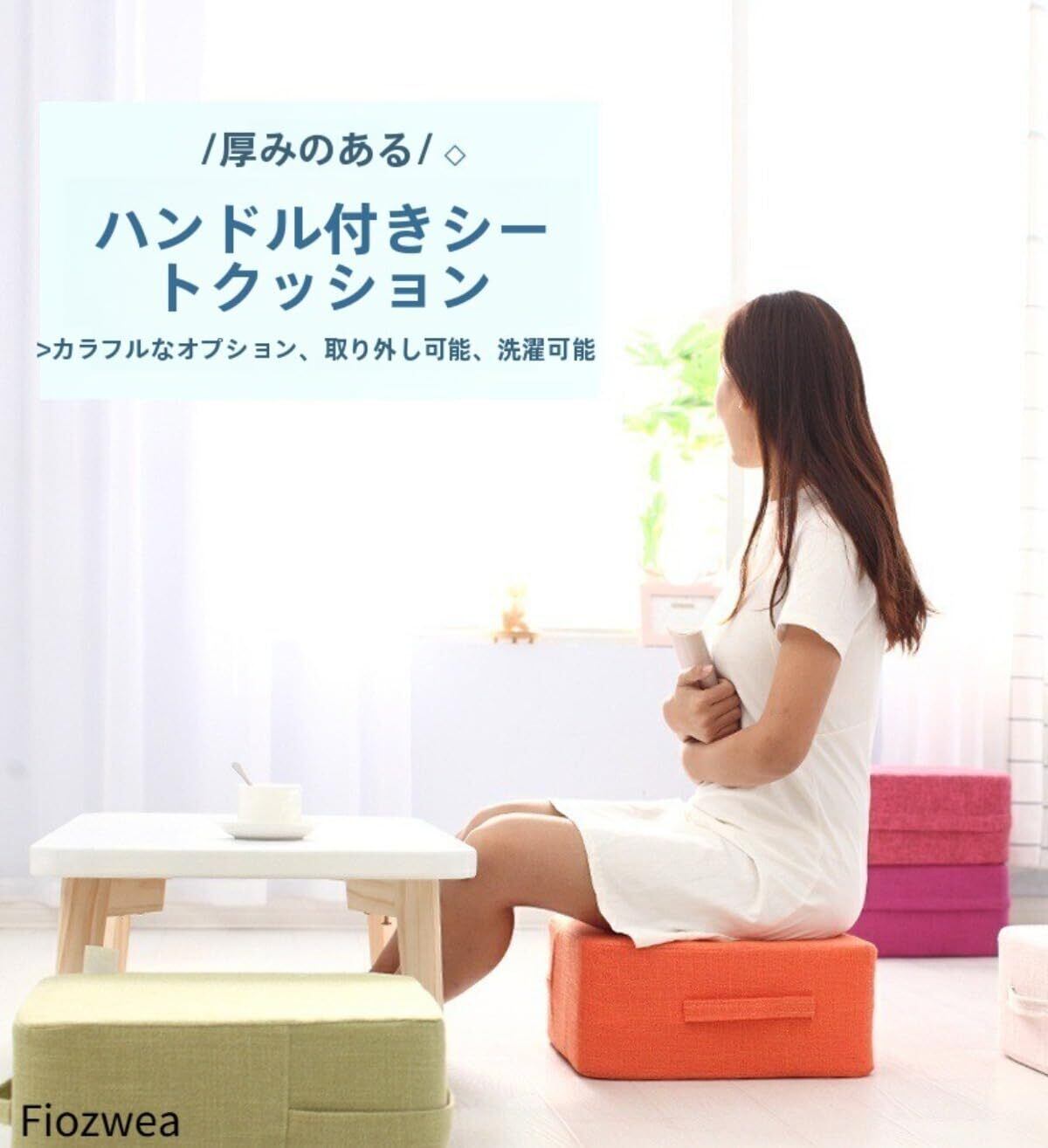 Fiozwea重さ600gと超軽量! 小さなこどもさんにも持ち運びできると大人気のリビングクッションです。 重ねると約40cmとキューブ(立方体)のイスのように使えます。 使用しないときはコンパクトに片づけられ、来客時にサッと取り出せます。 マタニティ期、玄関で靴を脱ぎ履きする際の腰掛けとしても重宝するロータイプクッション。 お年寄りや介護が必要な方がいらっしゃるご家庭にも役立ちます。